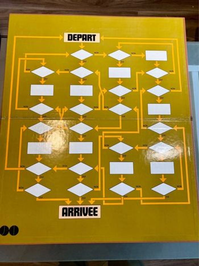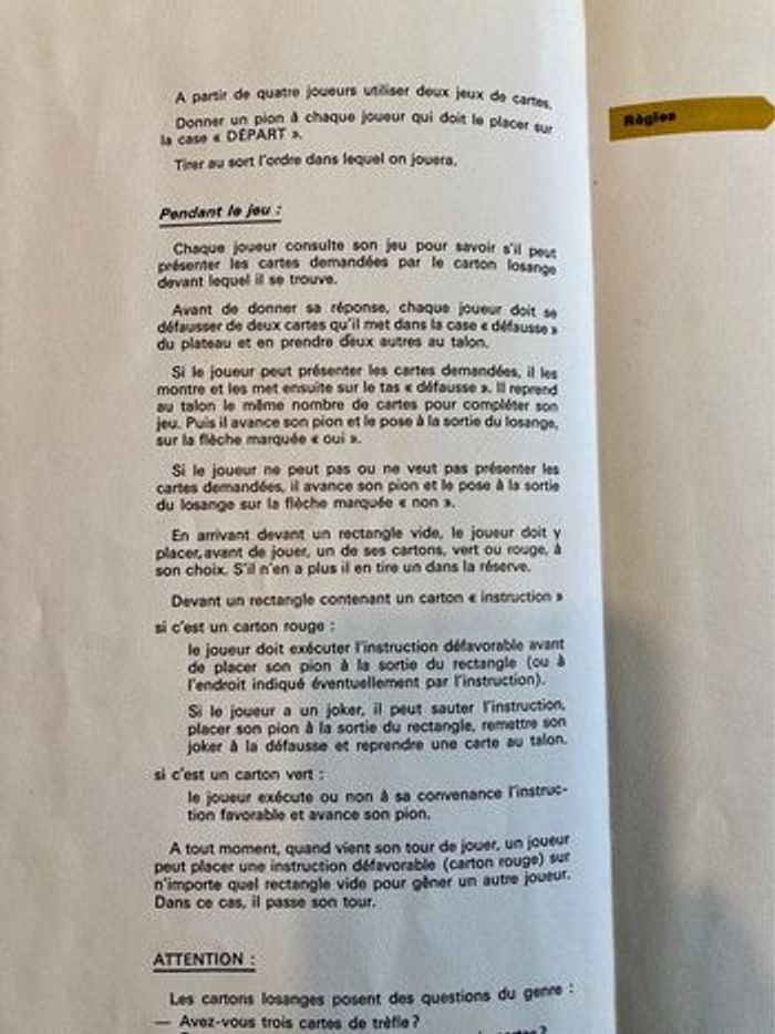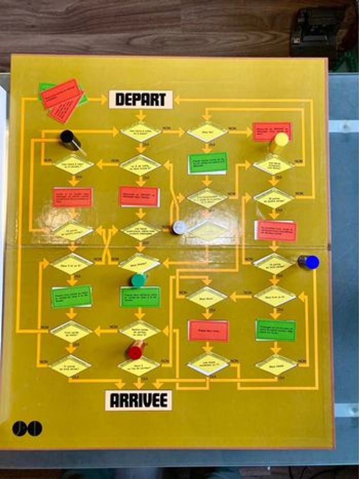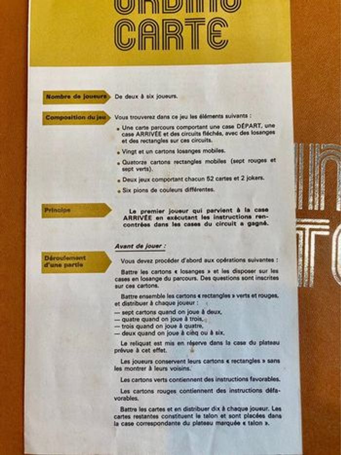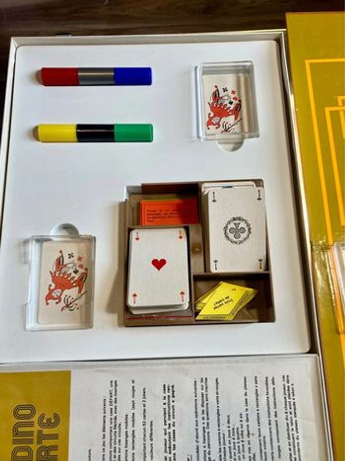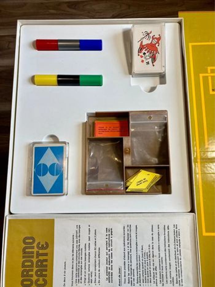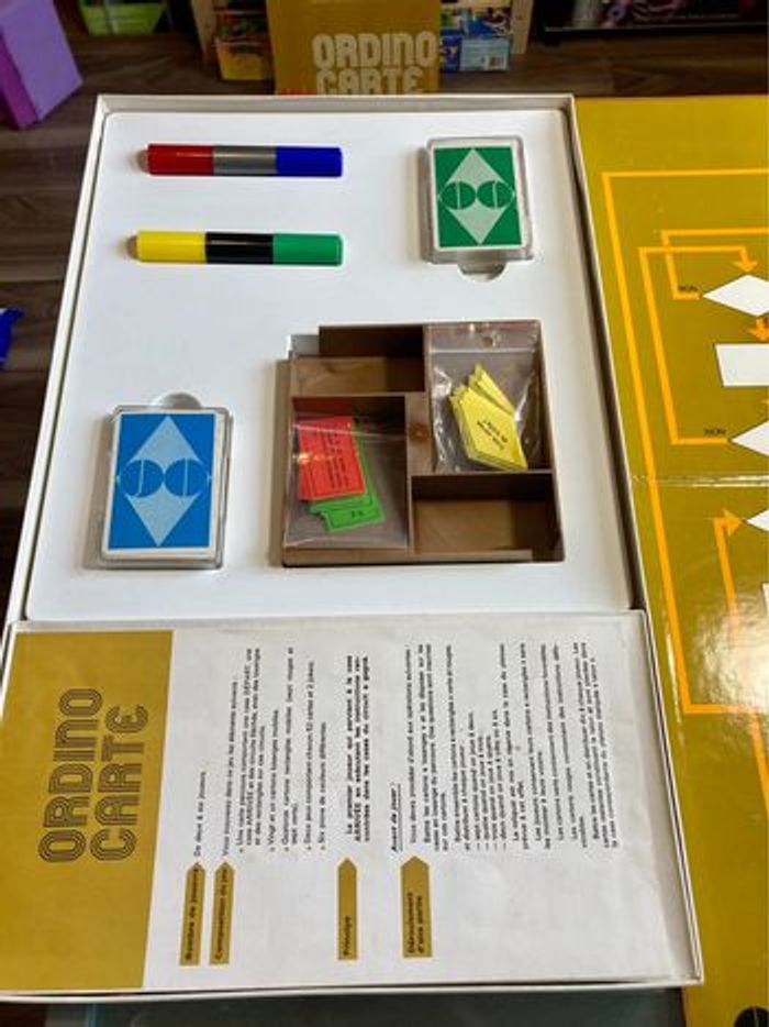 Rare jeu de société complet ,vérifié, recompté. Austère de prime abord, il s'agit en fait d'un jeu convivial et passionnant, dont les règles sont simples, mais les possibilités stratégiques nombreuses. 2 à 6 joueurs dès 12 ans. Contenu de la boite en parfait état. Tous les pions, cartes des deux paquets, et tous les cartons d'évènements aléatoires sont présents. Le but est d'effectuer un parcours de case en case, en répondant à des critères aléatoires avec sa main ( Jeu de cartes classique ) et si possible prévoir quelques coups d'avance en gérant vos cartes comme une ressource. Il faudra aussi composer avec les pièges et autres gages que pourront vous infliger vos adversaires. Jeu original, et authentique produit des années 70. L'arrête de la largeur au bas de la boite est déchiré aux angles comme vous le verrez sur les photos, mais il tient sur toute la longueur et ne se montre pas fragile. Retrouvez nos autres jeux : #JeuxLootboxAvenue Et notre sélection de produits 80's 90's : #OldiesLootboxAvenue Emballage soigné, expédition rapide ✔ @LootboxAvenue #collector #vintage #collection #lootboxavenue #ancien #vieuxjeu #jeuancien #jeuhachette #seventies #années70 #jeudecarte #jeudecartes #jeudecollection #jeudestratedie #jeudestratégie #strategy #strategygame #maths #jeuxvintage #jeudeplateau #jeudesociété #jeucollector #Ordinocarte #hachettevintage #hachettevieux #retro #eurequip #créationeurequip #jeurare #raregame #collectoritem #mathematiques #mathgame #binaire #programmation #rare #lootboxavenue #jeudeplateau #jeuvintage #jeuretro #famille #enfamille #fun #jeuderole #geek #partygame #boardgame #eighties #nineties #années80 #années90 #jeurare #raregame #jeudéquipe #jeudestratégie #ancien #vieux