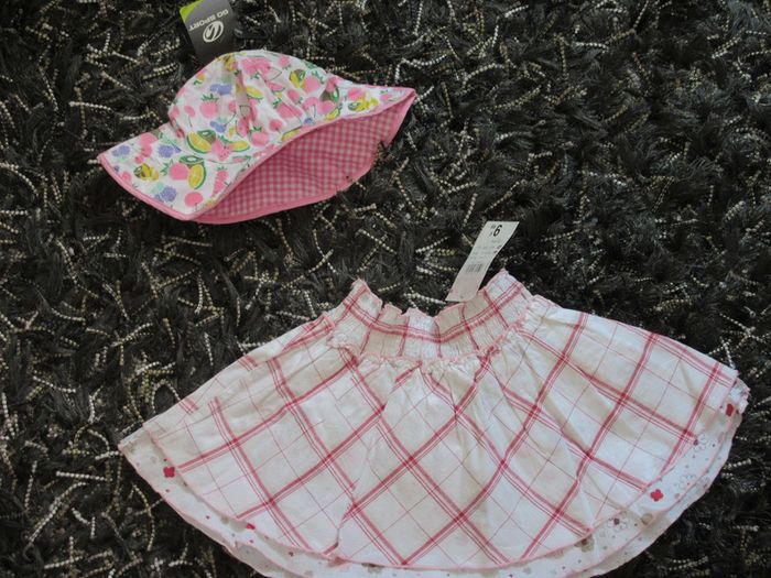 jupe + chapeau neuf taille 2 ans jupe neuve taille 2 ans(gémo) bob/chapeau réversible taille 51 neuf (go sport)