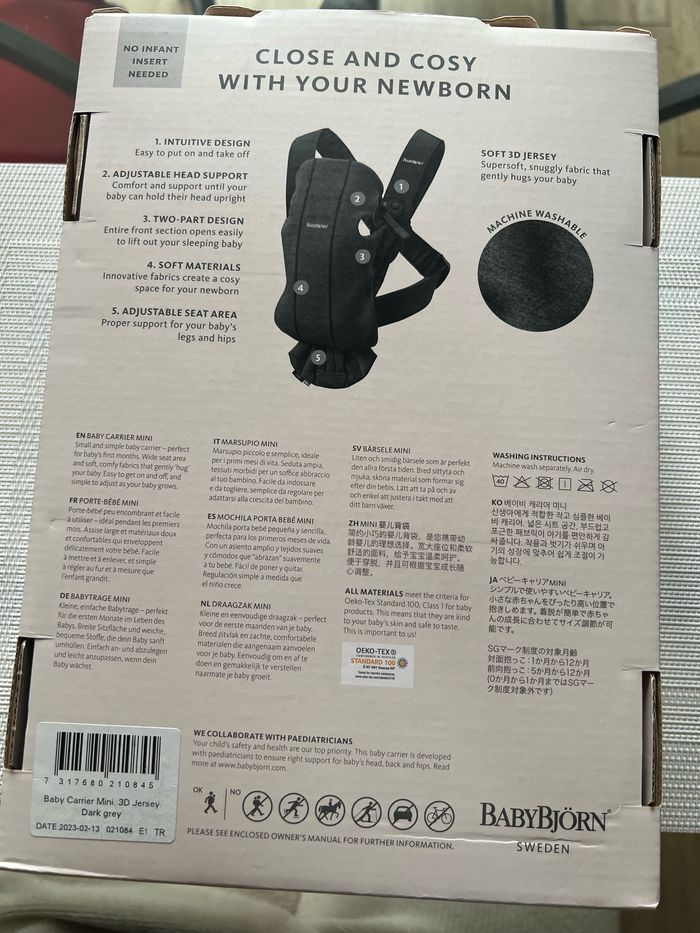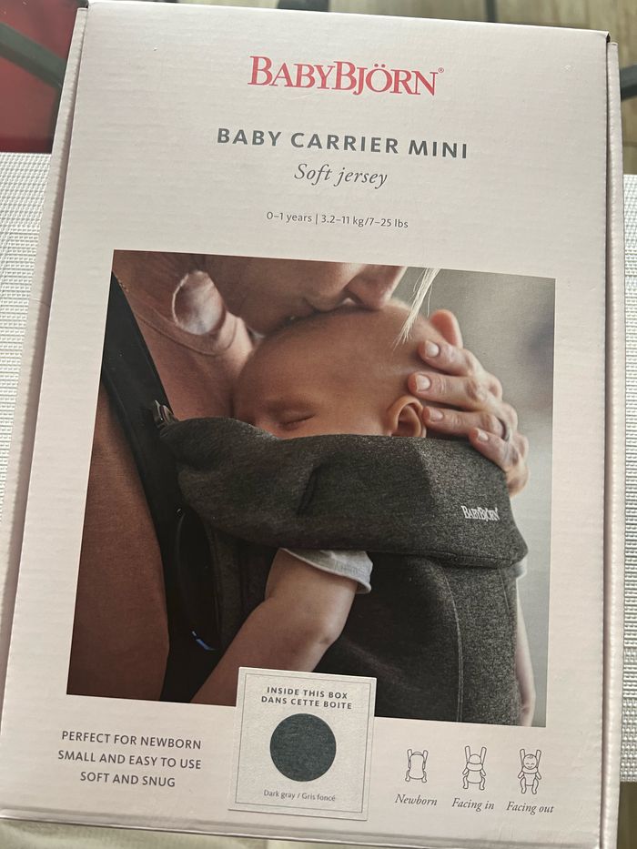 Porte bébé Babybjörn carrier mini en très bon état. Très peu utilisé car acheté en avril 2023 et porté que quelques fois. Le bébé peut avoir plusieurs positions par rapport à son éveil. Prix d’achat 115€ en avril 2023. Prix négociable. Couleur gris foncé. Matière très agréable et souple pour le bébé. Porte bébé qui fait de la naissance à 1 an. Vendu avec ma boîte d’origine ainsi que les documents et la facture.