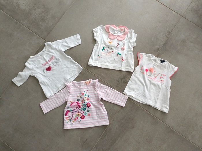 Lot de 4 tee-shirts en 3 mois 2 manches longues et 2 manches courtes En très bon état Différentes marques : 1 Boite a malice 2 Du pareil au même 1 Kiabi