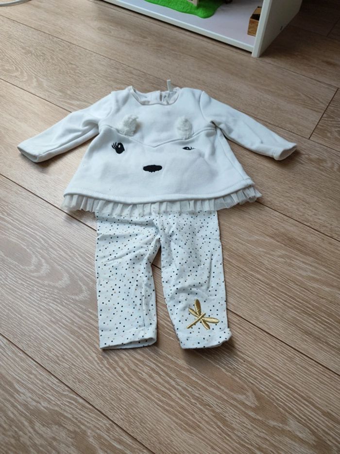 Ensemble composé d'une robe pull intérieur velours et d'un legging à pois. Très bon état Marque orchestra taille 9 mois