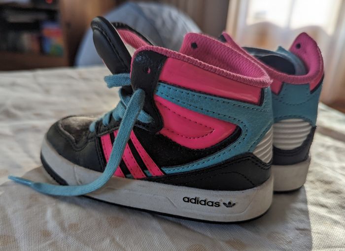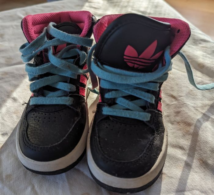 Baskets hautes noires et roses adidas Lacets bleus Peu portées, très bon état Chua