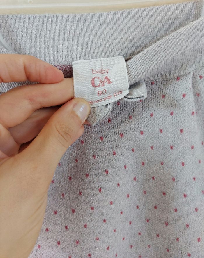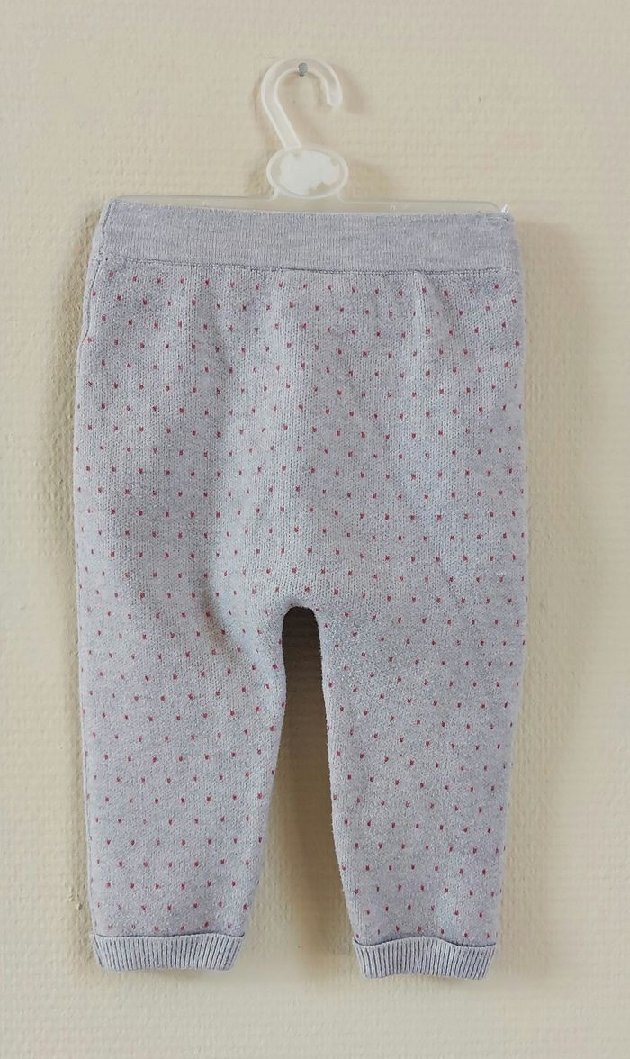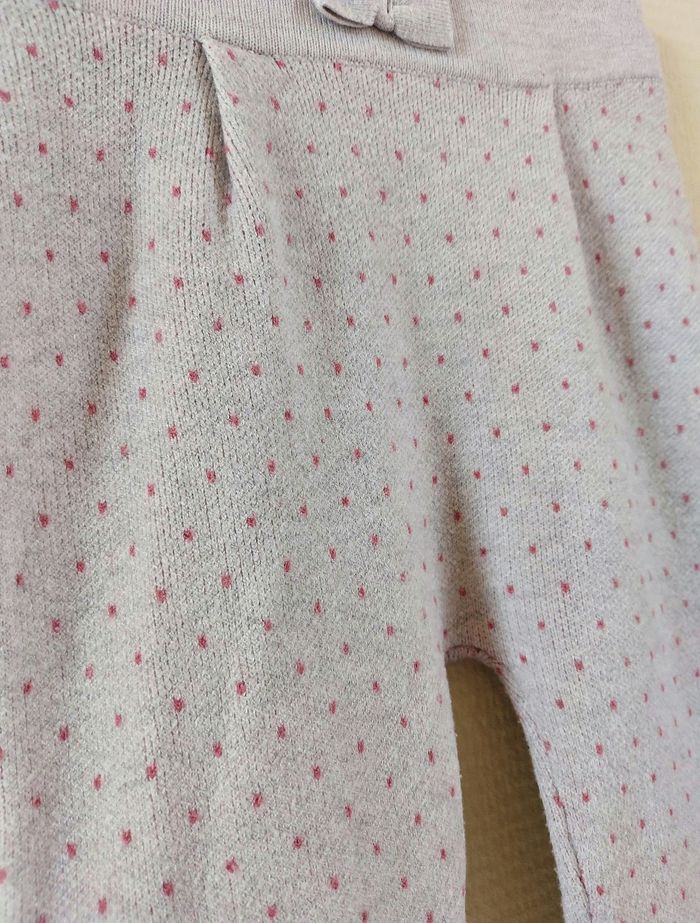 Je vends un pantalon gris à petits pois rose/rouge venant de chez C&A. Il est assez épais. Taille : 80 cm (9- 12 mois). Utilisé mais reste en bon état.