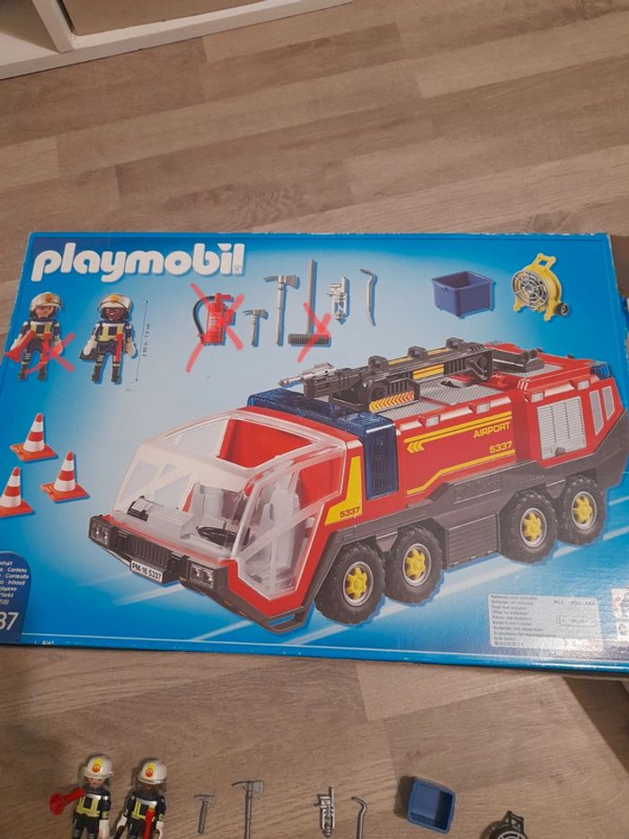Playmobil 5337 - Pompiers avec véhicule aéroportuaire - Playmobil City Action. Manque trois éléments une lampe torche,l extincteur, et le balai ( voir croix rouge sur photo) #metolosajojeux