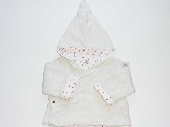 Veste en molleton de marque PETIT BATEAU en état excellent, couleur gris chiné, revers imprimé rouge, à capuche, fermeture croisée.