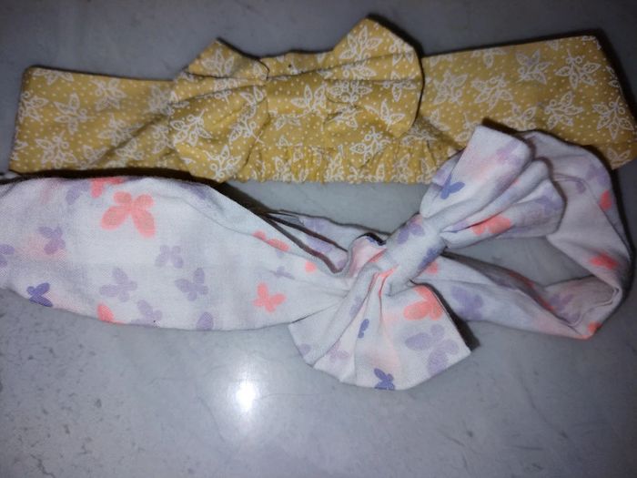 Lot de deux bandeaux bébé - un blanc avec papillons violet et rose 6/23 mois - un jaune natalys taille unique N hésitez pas à voir mon dressing réductions si lot 😉