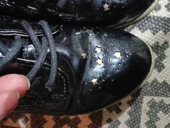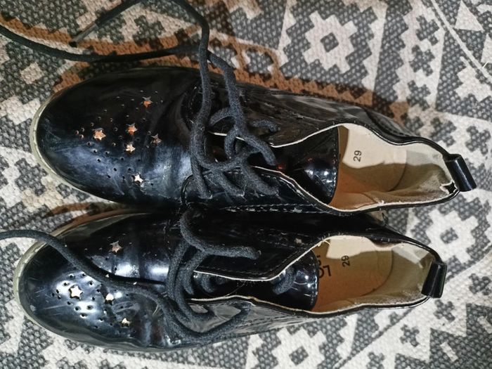 Chaussures vernies noires avec étoiles dorées En 29 A lacets A l'arrière de la chaussure léger décollement mais qui n a jamais gêné ma fille Légèrement griffées sur le devant mais restent très jolies et donne a la tenue beaucoup de classe N hesitez pas à aller voir mon dressing réductions si lot 😉 J envoie directement chez vous en Colissimo au même tarif qu un mondial Relay
