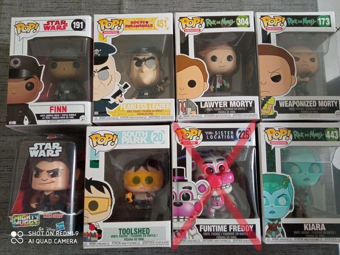 Vends POP neuves POP Star Wars Finn : 11€ POP Fearless Leader : 12€ POP Lawyer Morty : 14€ POP Weaponized Morty : 14€ Figurine Star Wars : 10€ POP South Park Toolshed : 15€ POP Kiara : 11€ Prix si lot Dites-moi ce qu'il vous intéresse et je vous ferais une annonce