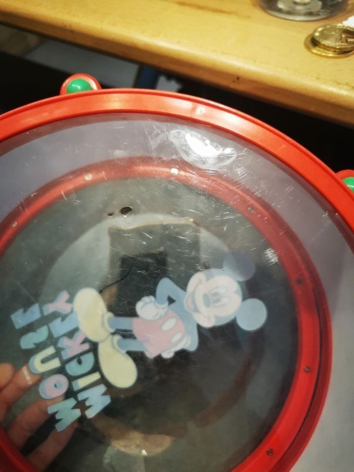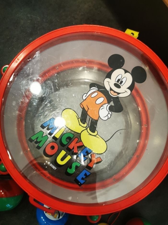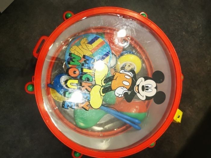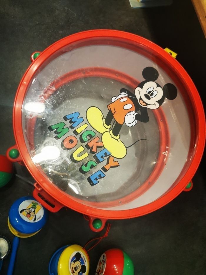 Instrument de musique tambour maracasse tambourin et claquette le tambour s'ouvre pour pouvoir rager le tout à l'intérieur en très bon état hormis deux traces de baguettes un peu prononce sur le peau de tambour voir photos acheter à disneyland
