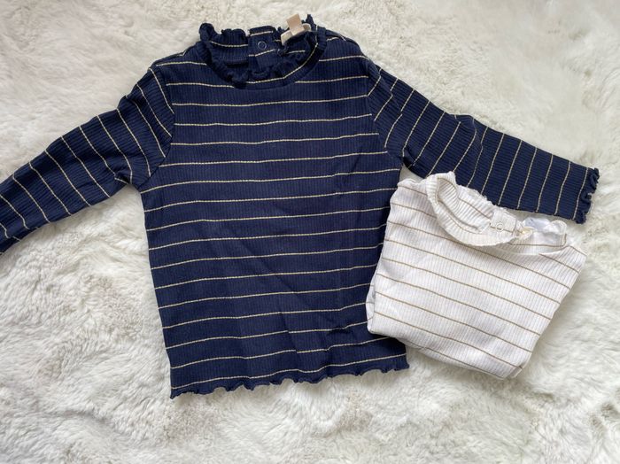 Lot de 2 tee-shirts manches longues DPAM taille 18 mois. Un bleu marine et un blanc avec rayures dorées. Bien porté mais restent en très bon état.