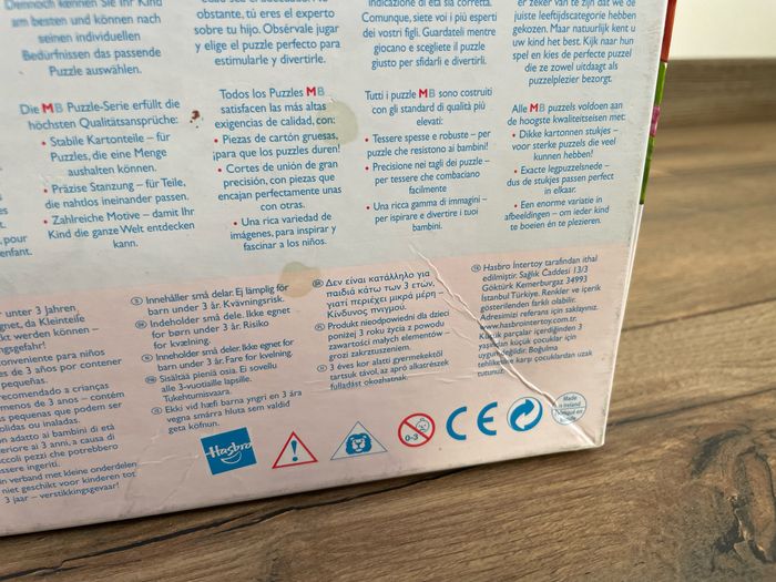 2 puzzles de 25 pièces dans la même boîte Boîte abîmée mais permet encore de protéger les puzzles Les pièces présentes des traces d’usures mais n’empêche pas de faire les puzzles