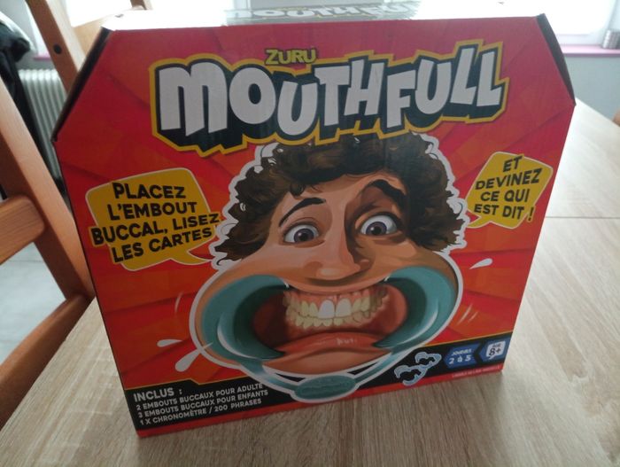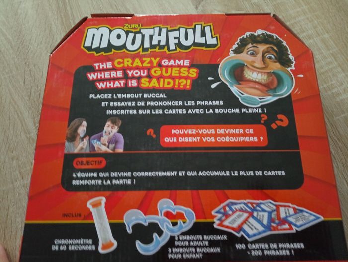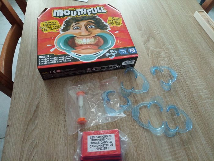 Le rire signifie amusement, le plaisir signifie Mouth Full. Un jeu pour petits et grands et amusant pour toute la famille. Grâce aux barrières à dents, vous ne serez pas seulement totalement drôle, mais vous ne pouvez pas vraiment parler. La buccale empêche la bouche de se fermer et donc de parler correctement. Tout d'abord, deux équipes sont formées, le premier joueur d'une équipe commence à mettre un embouchure et doit tirer des cartes sur lesquelles se trouvent des phrases prédéfinies. L'objectif est de comprendre le plus de phrases possibles et de lire correctement avant que le sablier ne soit écoulé. Les cartes avec les phrases qui ont été correctement reproduites peuvent être conservées par l'équipe. Les cartes restantes sont données aux adversaires. L'équipe avec la plupart des cartes gagne !