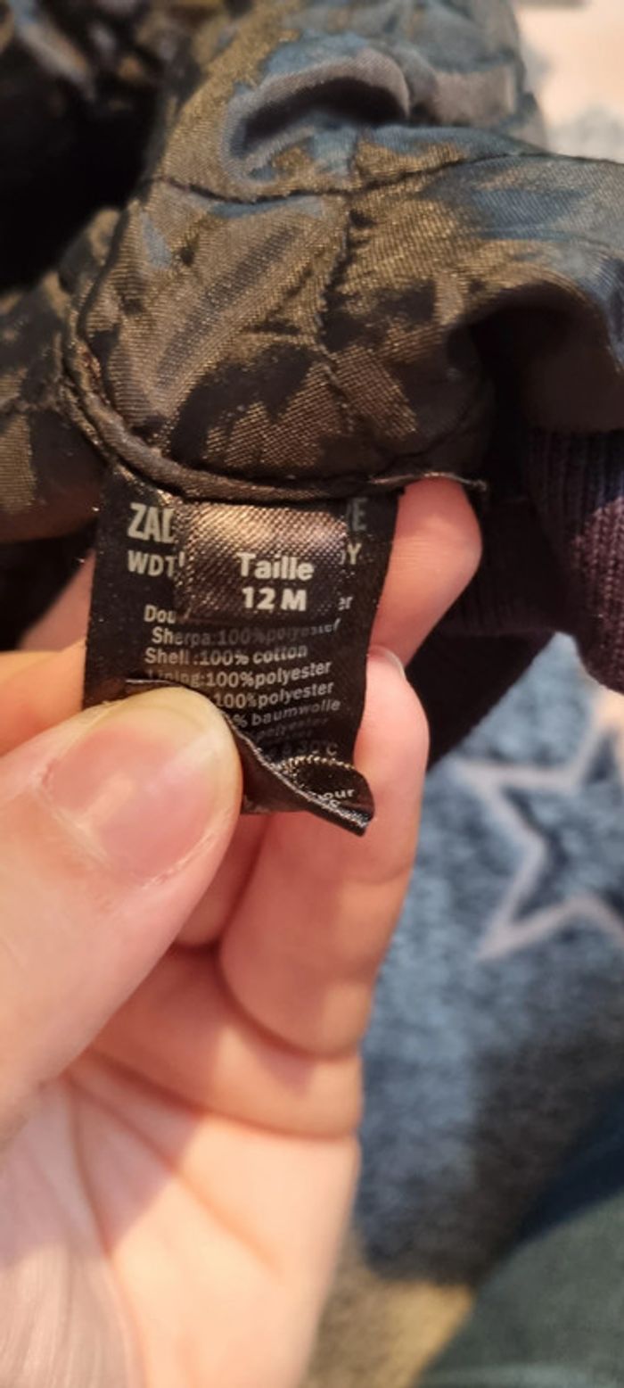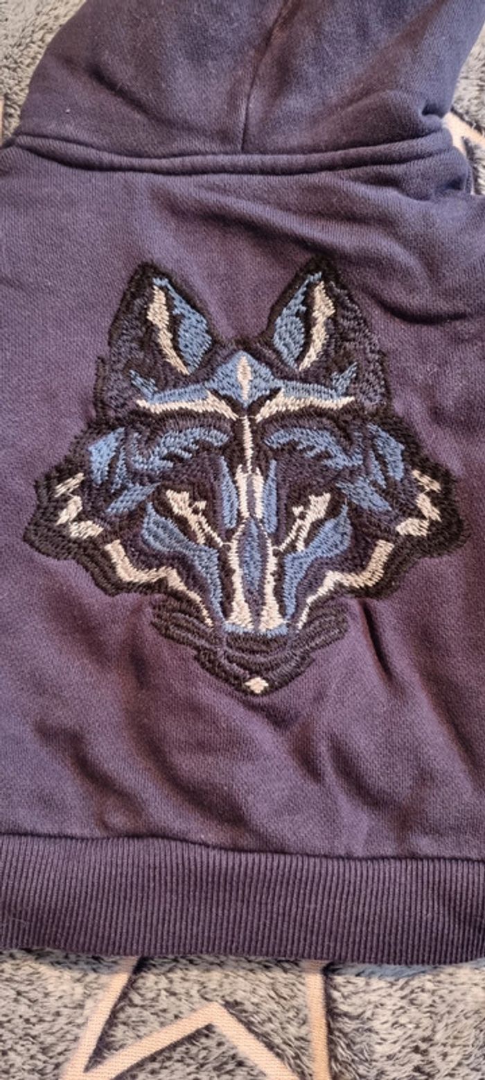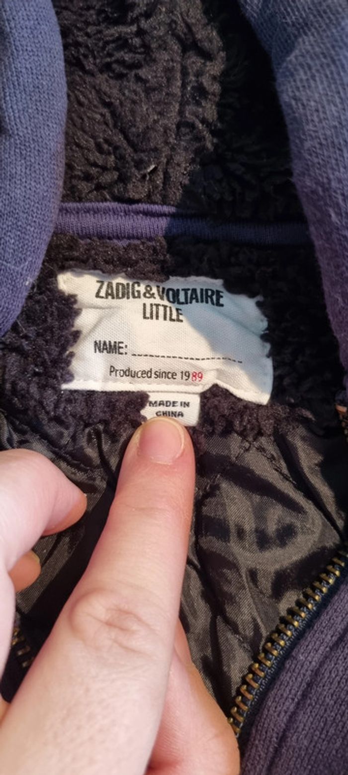 Superbe manteau epais zadig et voltaire bleu marine avec une tete de loup brodée dans le dos. Taille 12 mois. Fourrure à l'intérieur de la capuche. Zippé.