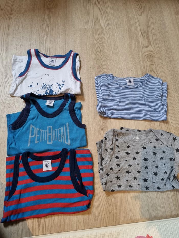 Lot de 5 maillots de corps: 3 débardeurs petit bateau, 2 manches longues (petit bateau et kiabi). Taille 24 mois. Très bon état.