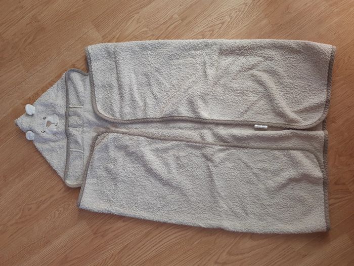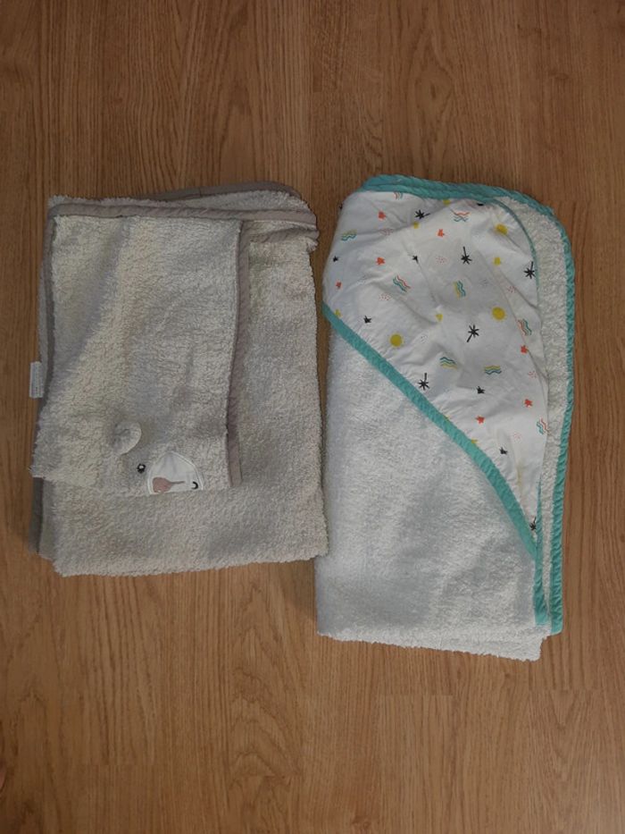 Lot de 2 cap de bain, une blanche et une beige/ marron. Taille unique pour les 2. La blanche est de la marque orchestra, dimension : 80×80 cm La beige/ marron est de la marque sucre d'orge, dimension inconnue. Bon état.