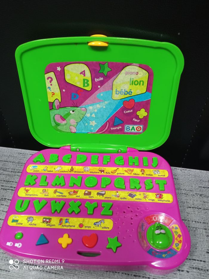 Vends petit ordinateur intéractif pour apprendre les lettres, mots, chiffres, formes... Fonctionne très bien