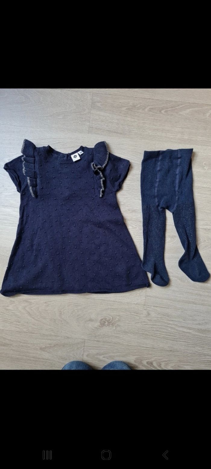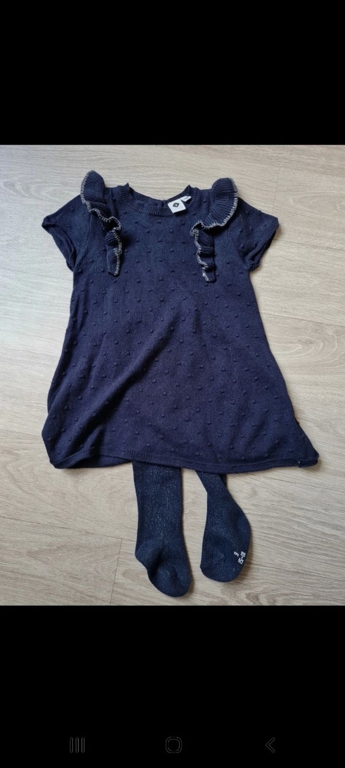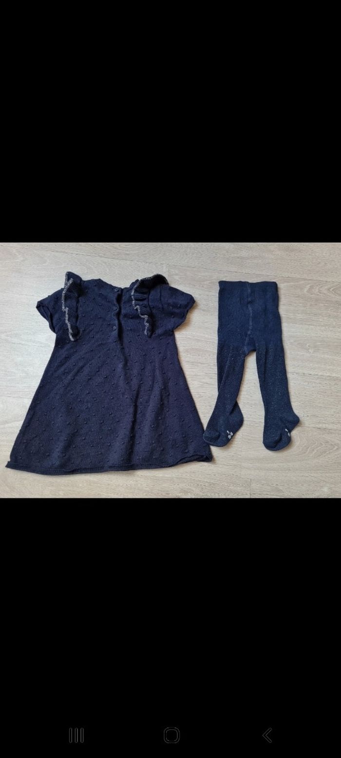 Ensemble robe en maille manches courtes bleu marine avec volants liserés argenté, tissu texturé avec petits "pompons". Boutons dans dos. Taille 6 mois. Paire de collants taille 15-18 marine avec paillettes. Marque Grain de Blé. Jamais portés. Tous mes articles sont lavés avant la vente.