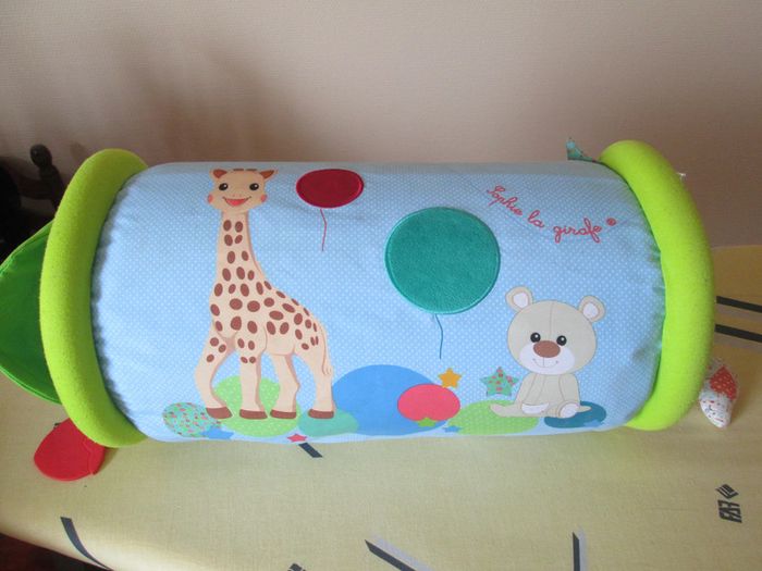 rouleau gonflable avec jeux d eveil differents hochets et texture autour grelots a l interieur du rouleau se gonfle et se degonfle grace a une valve securisee marque sophie la girafe bon état