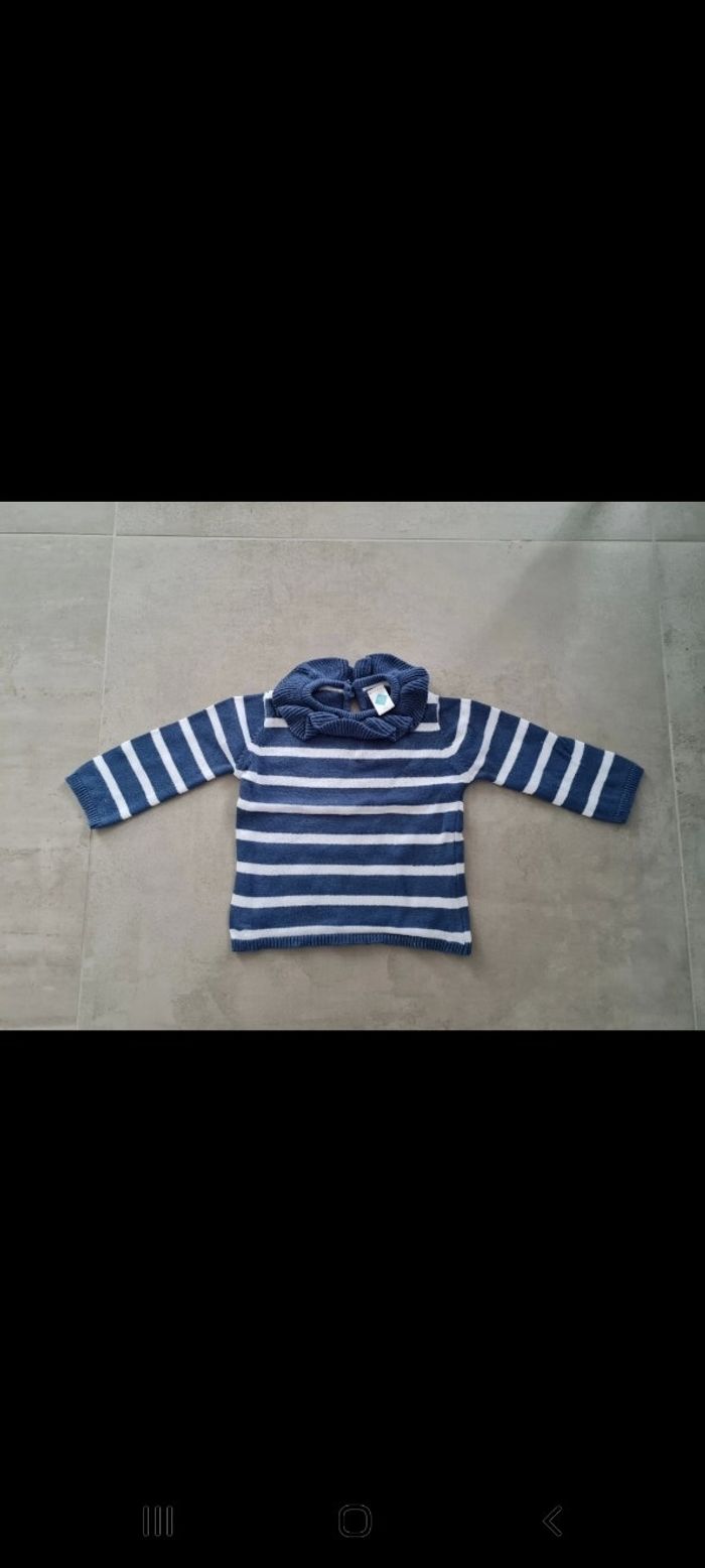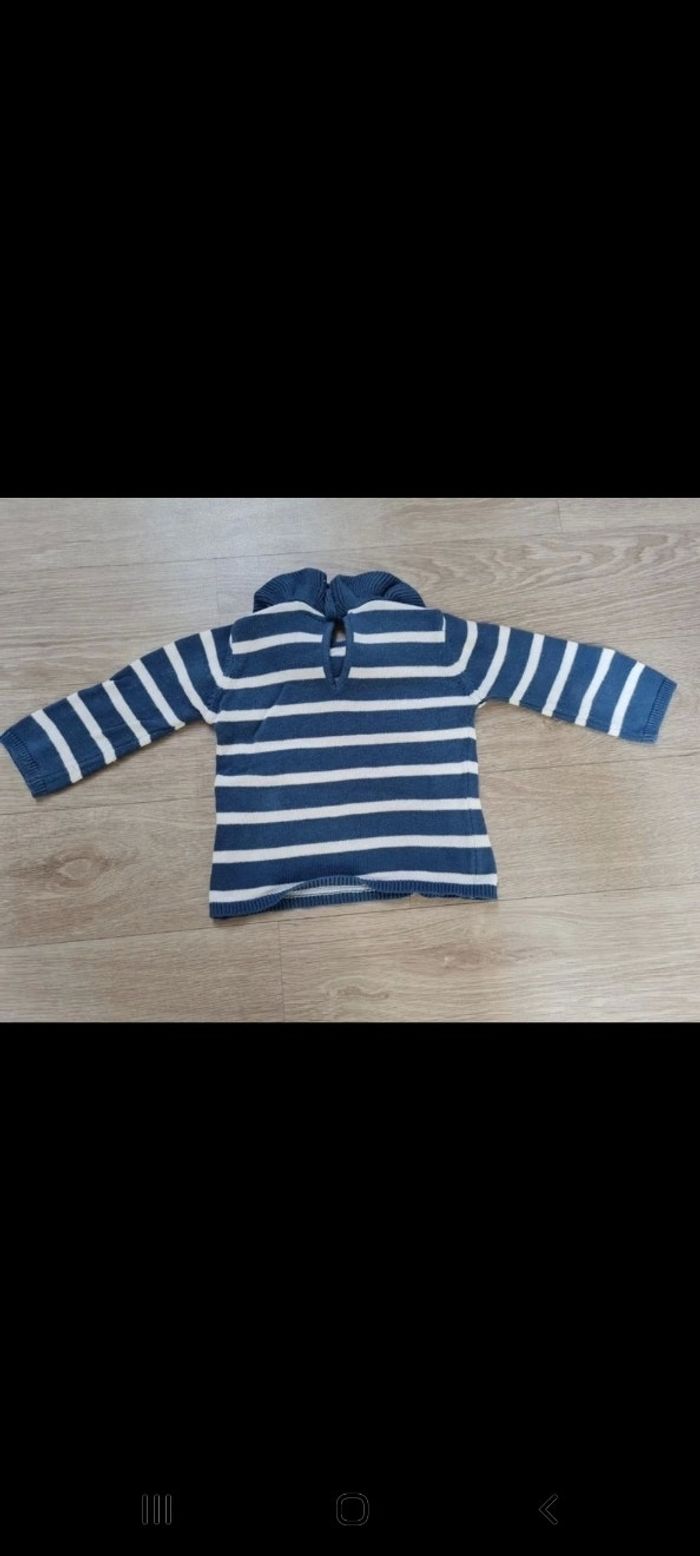 Pull style marinière bleu rayé blanc marque Tex. Col volanté, petit bouton et ouverture goutte d'eau au dos. Taille 6 mois. Excellent état, comme neuf. Tous mes articles sont lavés avant la vente