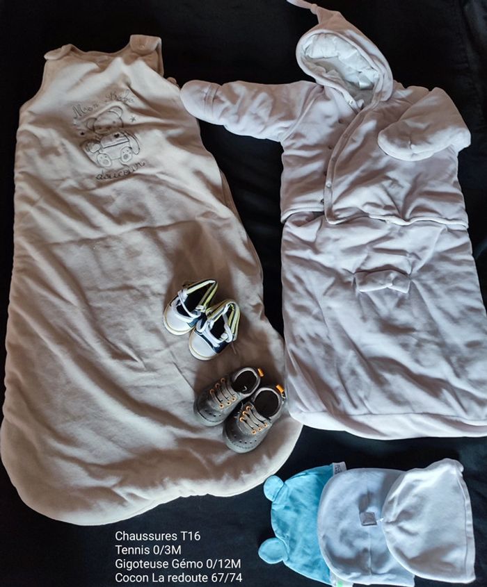 Chaussures taille 16 Tennis 0/3 mois Grenouillère 0/12 mois Cocon adaptable au cosy poussette etc 6/12 mois Bonnets x3