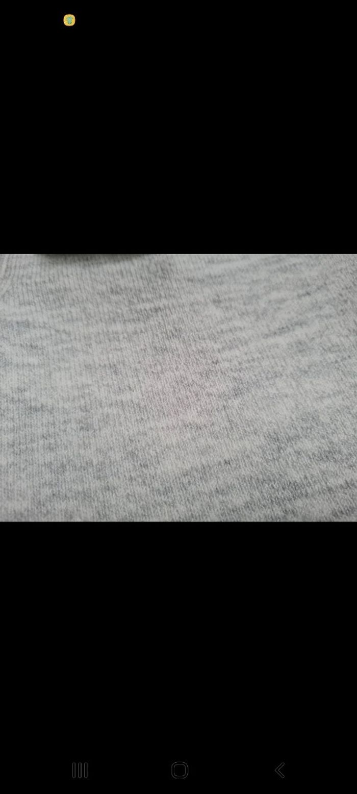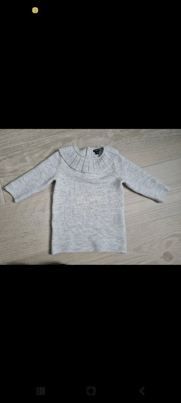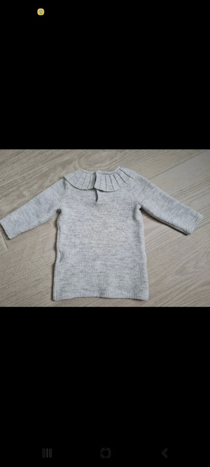 Ensemble: Robe pull gris chiné Kiabi avec collerette taille 6 mois. Boutons à l'arrière. Comme neuve, absolument pas boulochée. Vendue avec 5 paires de collants assortis taille 62-68 en excellent état également. Tous mes articles sont lavés avant la vente.