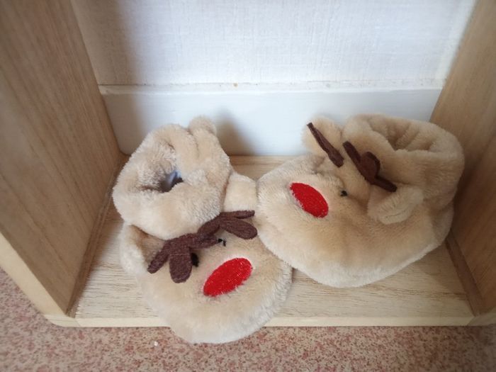 Chaussons tout doux motif rennes, mixte 0-6 mois environ. Fermeture par scratch sur les côtés intérieurs. Accompagnera parfaitement la tenue de Noël. Beaucoup d'autres chaussures , chaussons bébé, livres jeux jouets puzzles livres enfants également à vendre ds mon dressing et réduction activée.