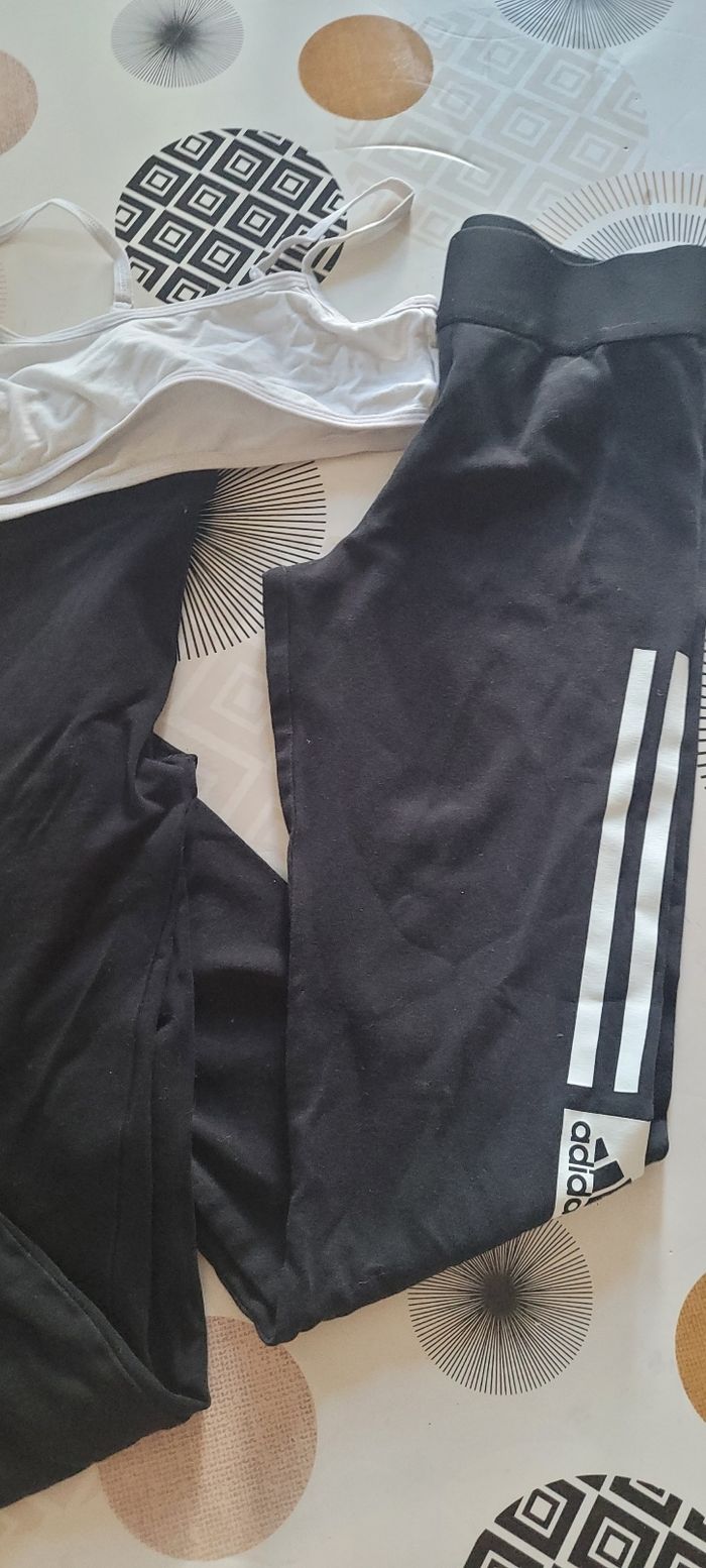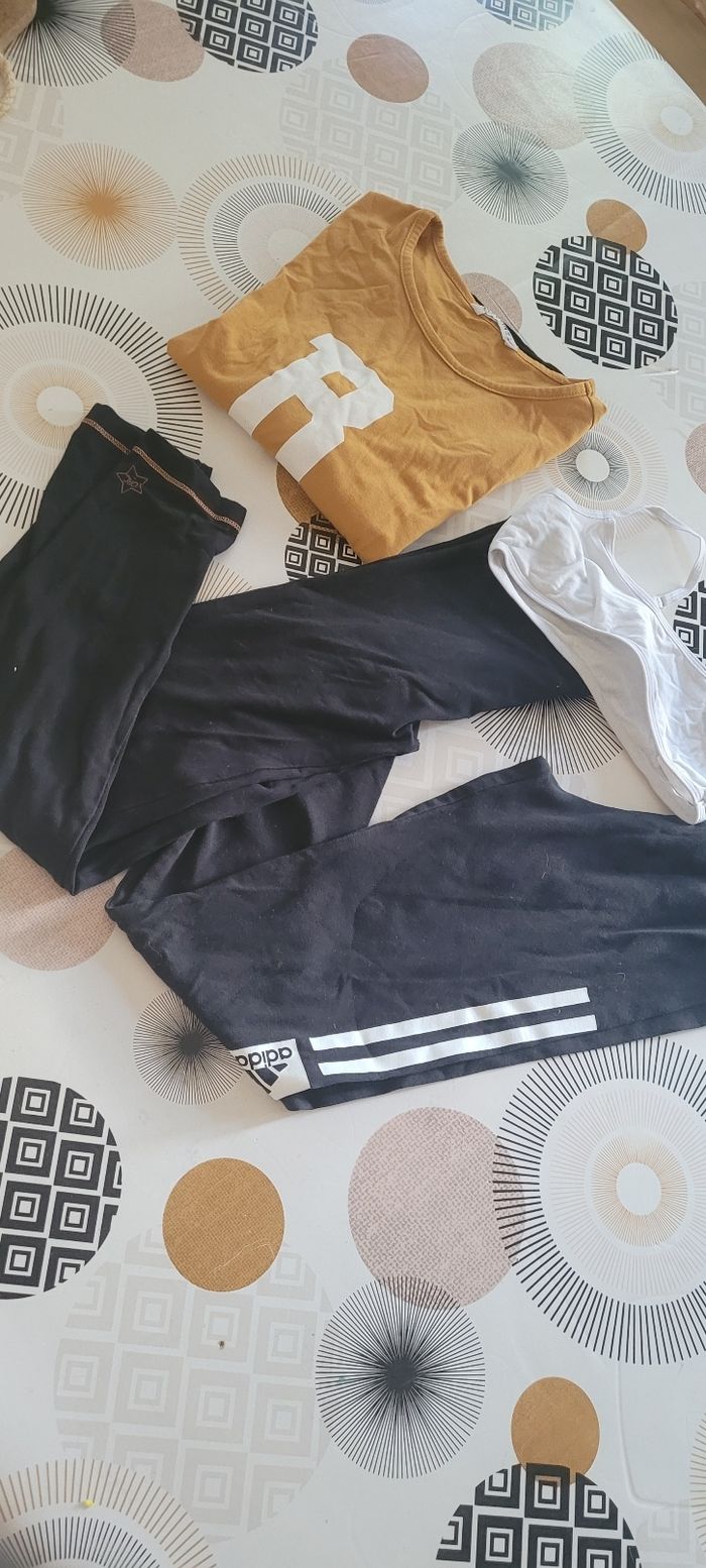 2 leggings dont 1 adidas et 1 orchestra 1 tee shirt 1 combinaison 1 brassiere