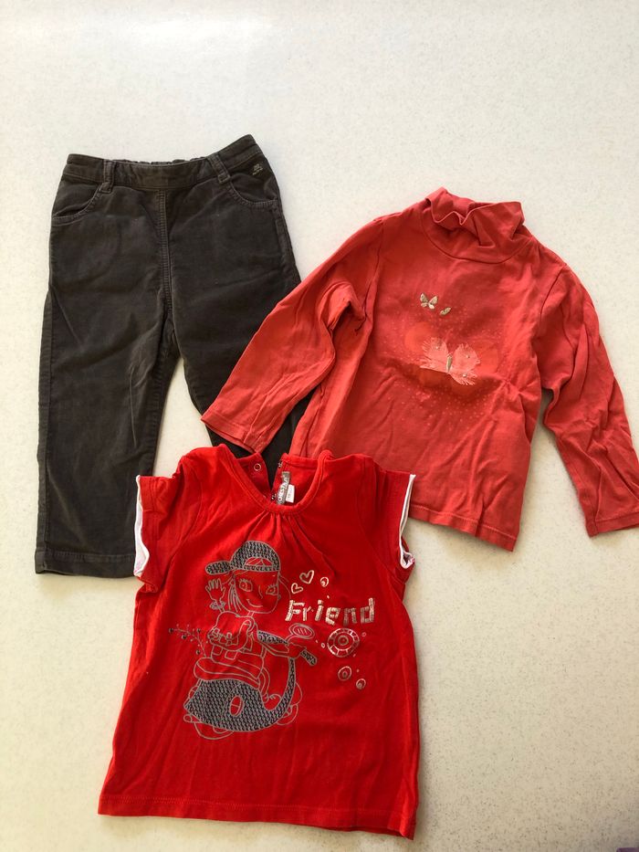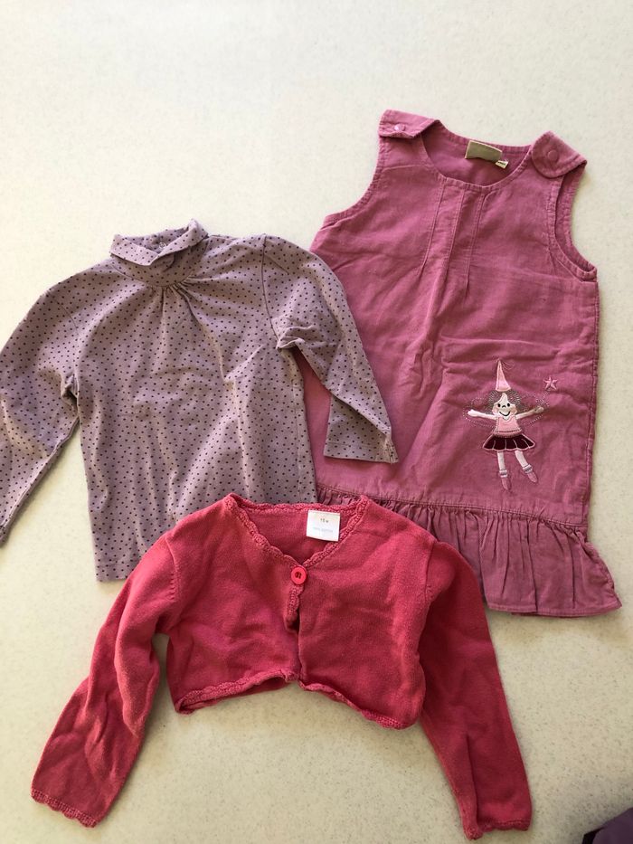 Lot bébé fille en taille 18 mois composé de huit articles : - Un pantalon Lily gaufrette en très bon état - Un T-shirt col roulé Obaibi en bon état avec un petit trou comme visible sur les photos. –un T-shirt orchestra en très bon état - Un T-shirt col roulé Gémo en bon état –une robe vertbaudet en bon état - une robe in extenso en bon état - une doudoune en très bon état ( d’eux petits défauts comme visibles sur les photos). -un gilet en bon état mais bouloché