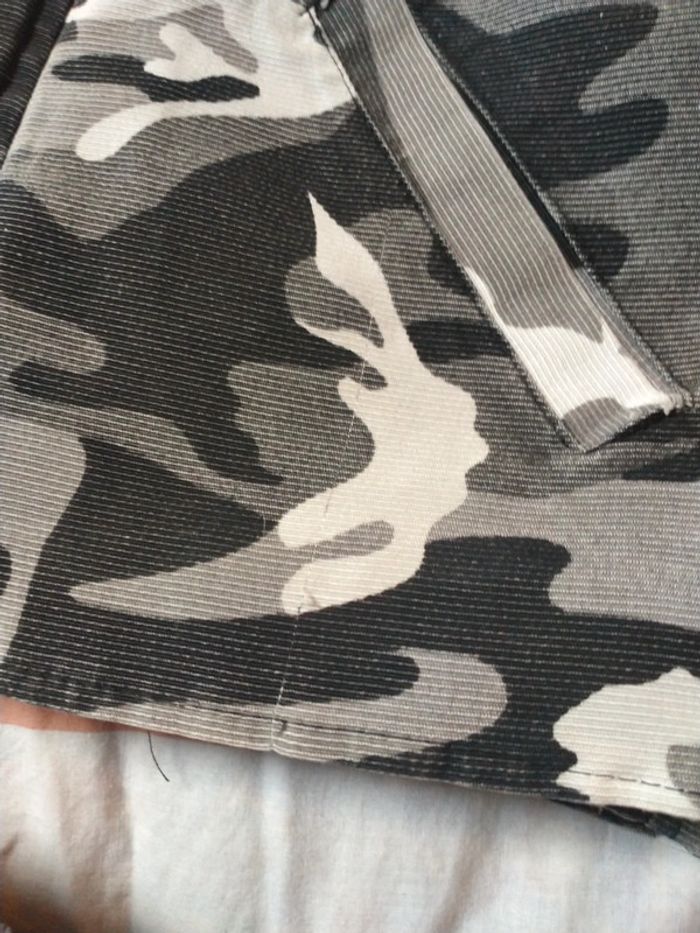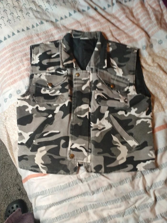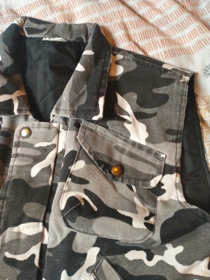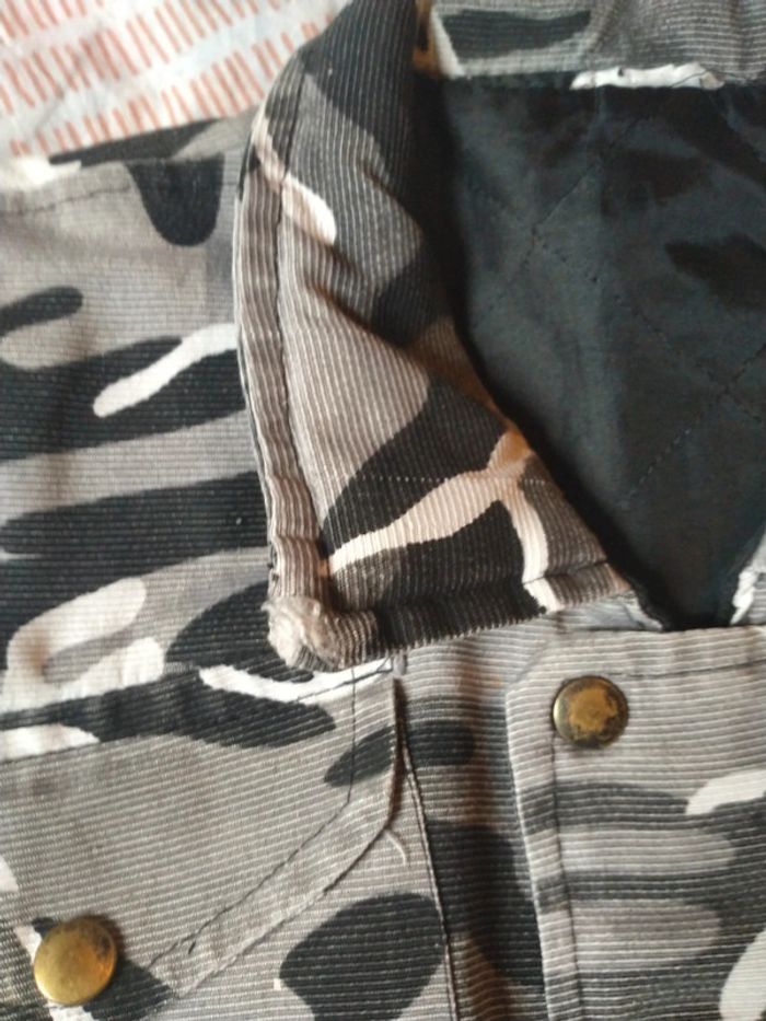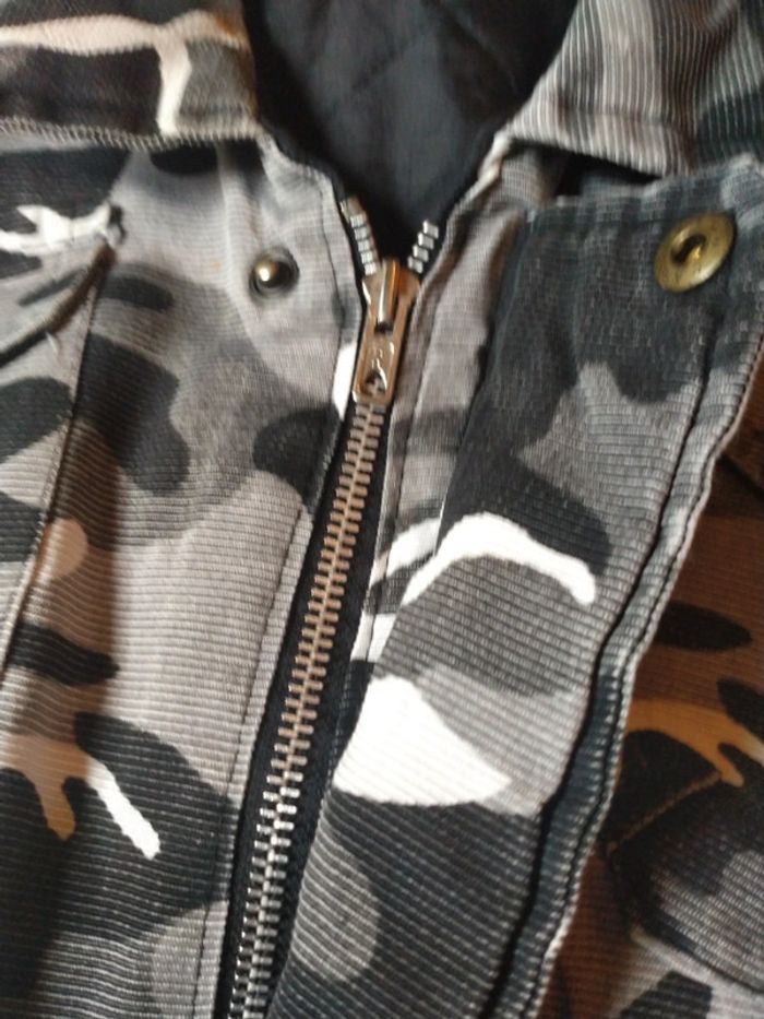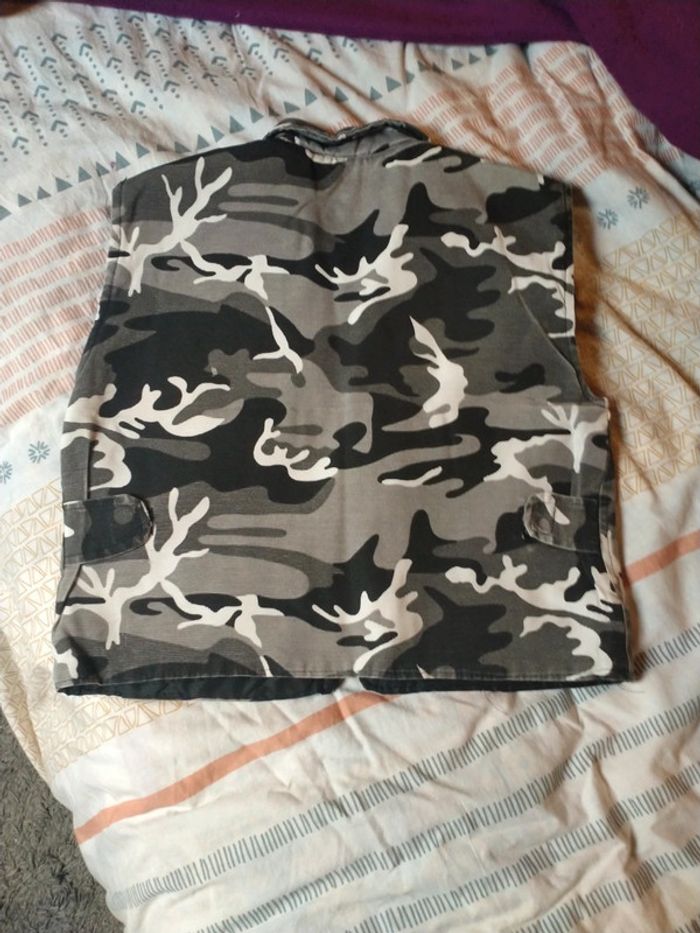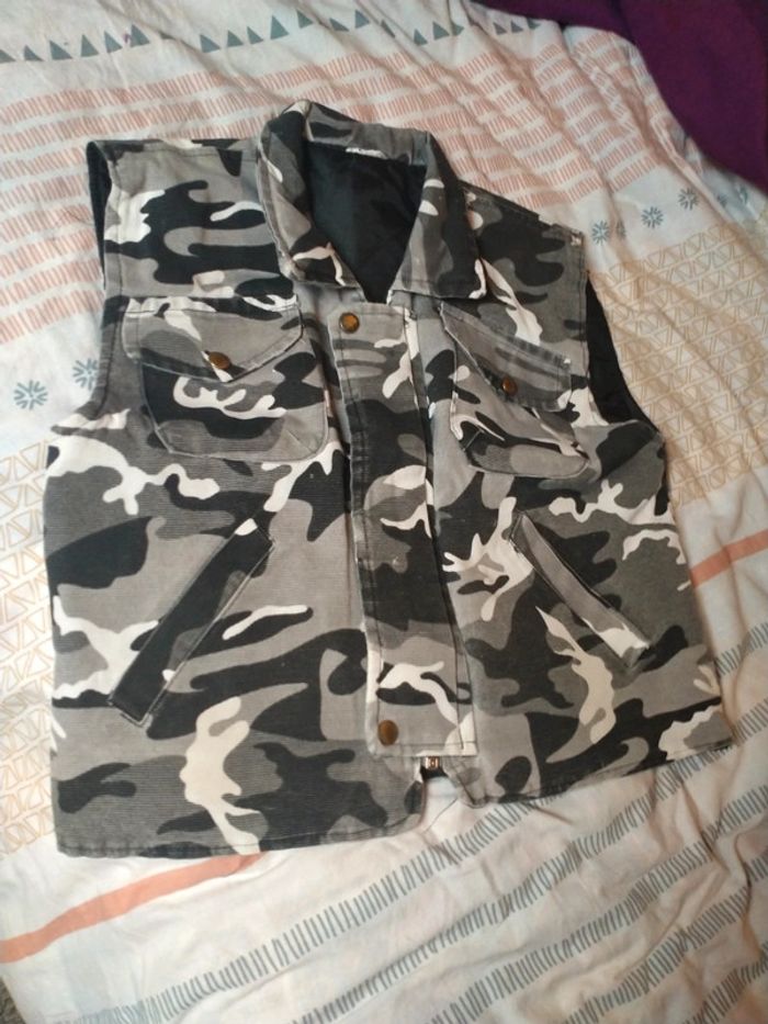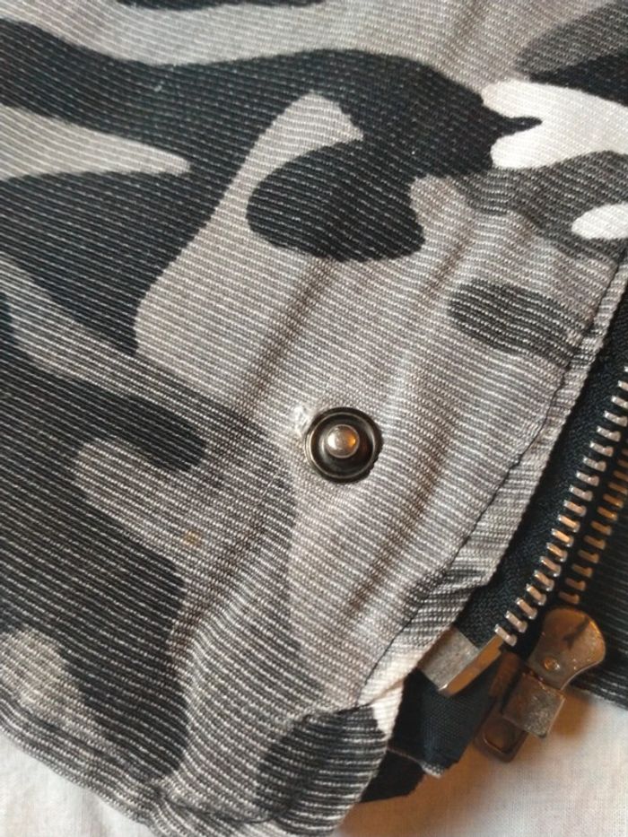 Porté, bon état général (voir photos) quelques petits signes d'usure. De couleurs noir, blanc et gris "camouflage". Poches multiples, se ferme avec pression et fermeture.