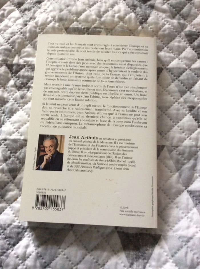 Tout va mal, et les Français sont encouragés à considérer l’Europe et sa monnaie unique comme la source de tous leurs maux. Par l’abstention ou le vote protestataire, ils sont tentés de saboter tout ce qui a été construit depuis quarante ans. Cette situation révolte Jean Arthuis, bien qu’il en comprenne les causes : l’ineptie d’avoir doté des pays avec des économies aussi disparates que l’Allemagne et la Grèce d’une monnaie unique ; la frénésie d’élargissement qui aggrave le problème année après année ; l’hypocrisie et la veulerie des gouvernements de l’Union, dont celui de la France, qui s’emploient à rendre inopérant un système qu’ils font mine de défendre en faisant de l’Europe le bouc émissaire commode de tous leurs échecs. Mais revenir à une France isolée et sortir de l’euro n’est tout simplement pas envisageable : qu’on le veuille ou non, l’économie s’est mondialisée, et de surcroît, notre énorme dette publique est libellée en euros. Un franc dévalué précipiterait le pays dans l’abîme, n’en déplaise aux irresponsables qui font miroiter cette fausse solution.