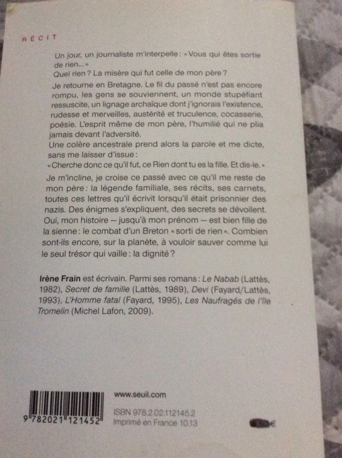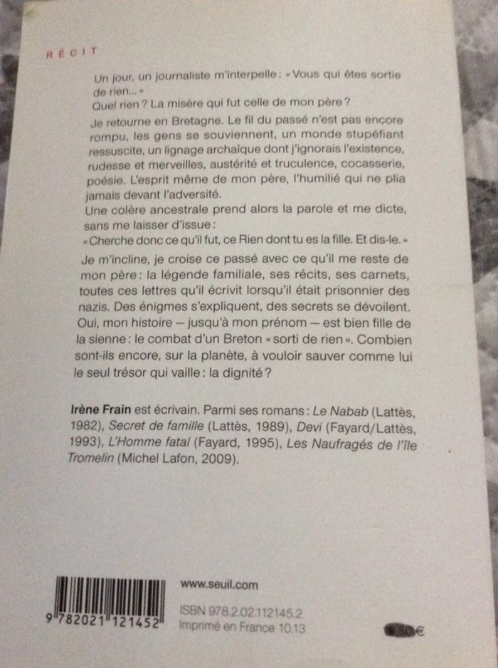 Parce qu'elle s'est sentie humiliée publiquement lorsqu'un journaliste l'a présentée comme 'sortie de rien', Irène Frain est partie à la recherche de ses origines paternelles. de cette quête est né ce témoignage sur le parcours de son père breton. .