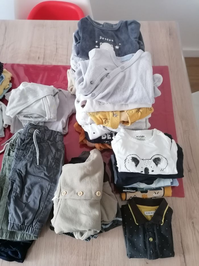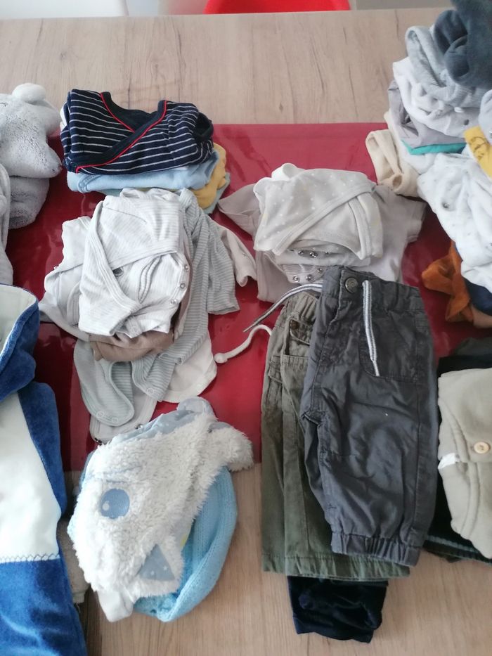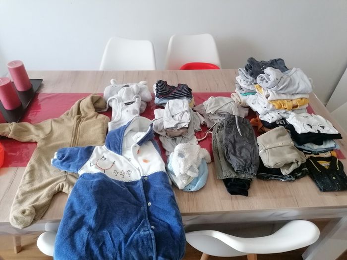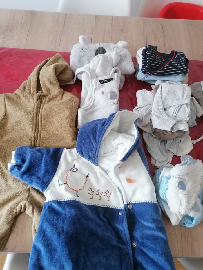 À vendre un lot de vêtements en 1 mois pr garçons. Pyjamas bodys pantalons gilets bonnet etc ...