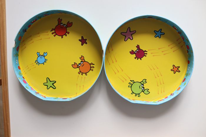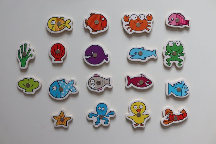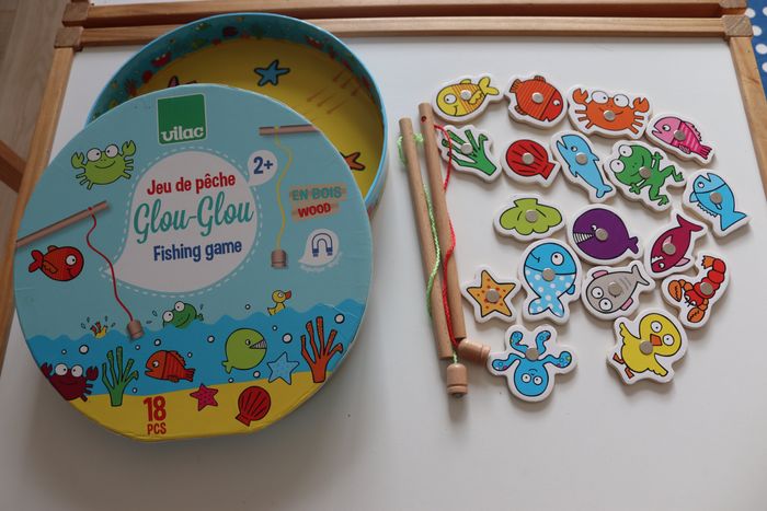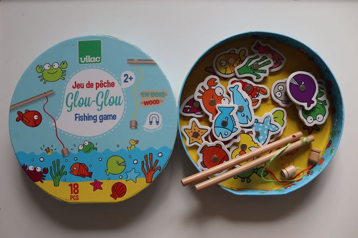 Jeu de pêche "Glou-glou" de Vilac. Un jeu en bois à jouer seul ou à deux. Attraper grâce aux cannes à pêche les habitants de la mer, tous aimantés. Contenu : 18 pièces magnétiques en bois et 2 cannes à pêche. Dimensions : 25 x 25 x 6 cm.