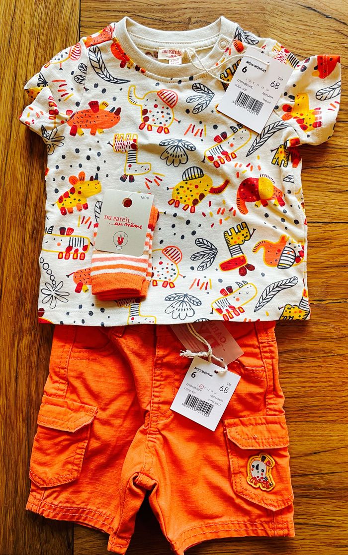 Un ensemble tee shirt+short+chaussette Du Pareil au même, taille 6 mois, neuf, jamais porté, avec boîte cadeau.