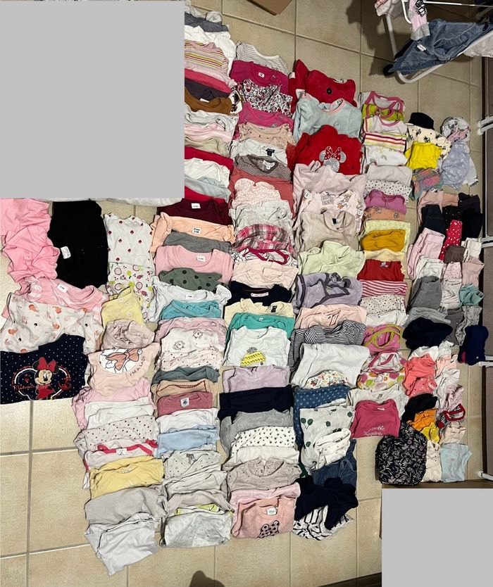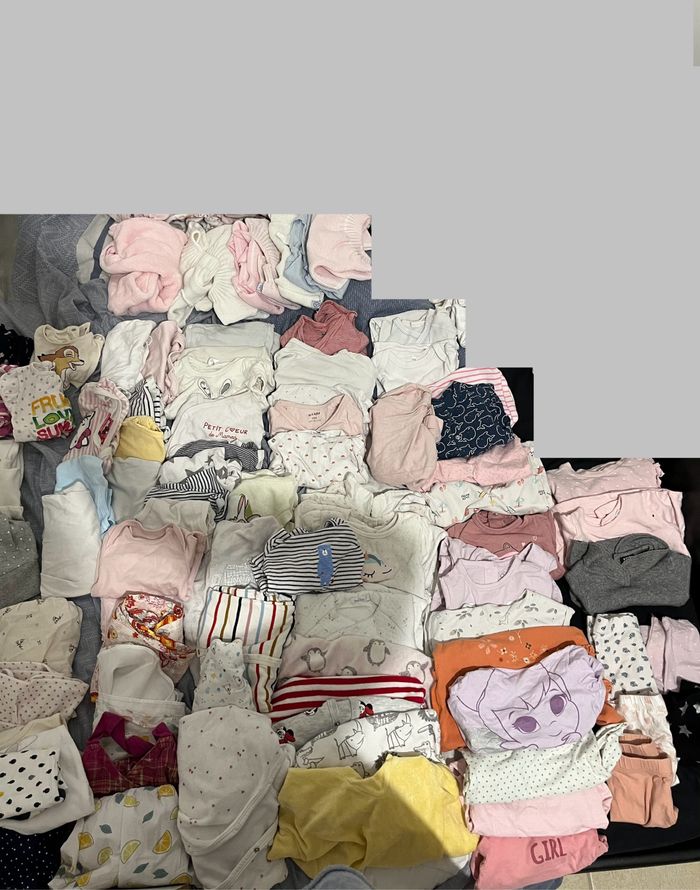 Bonjour, je vends beaucoup de vêtements bébé de 0 à 3 mois et des accessoires pour pouvoir acheter un nouveau lit pour ma fille de bientôt 2 ans , possibilité de faire un prix de groupe pour cela , je reste joignable pour tout renseignement, remise en mains propre uniquement pas de paypal ou autre style type transporteur: - Sur la première photo vous y trouverez : - [ ] un nid d’ange, deux gigoteuse pour saison estivale et une gigoteuse pour saison chaude. Le lot est vendu pour 20 € si acheter séparément : la gigoteuse chaude est 10€, les deux gigoteuse estivales et le nid d’ange est à 5€ chacun - Sur la deuxième photo vous trouverez Naissance: 7 pyjamas chauds 13. Bodys manches longues. 4 bodys manches courtes, 1. Pyjamas été. 1 pantalon été Je vends le lot pour 20€ - Sur la troisième et quatrième photos des vêtements de 1 mois: 3 pulls chaud 5 leggings 13 pyjamas été 14 pyjamas chaud 24 bodys manches longues 5 robes été 4 robes chaudes sans manche 4 pantalons chaud 4 t-shirt 5 pulls fin 13 bodys manches courtes 3 shorts été Je vend le lot pour 30€ - sur la cinquième photos vous trouverez des vêtements bébé 3 mois : 40 bodys manches longues 3 pyjamas été 2 vestons été 1 veste chaude 5 barboteuse été 18 pulls fin différent motif 8 pulls chauds 11 pyjamas chauds 6 robes dont une été 21 bodys manches courtes 5 short 1 jupe 7 pantalons chauds 15 leggings 16 t-shirt Je vends le lot pour 60€