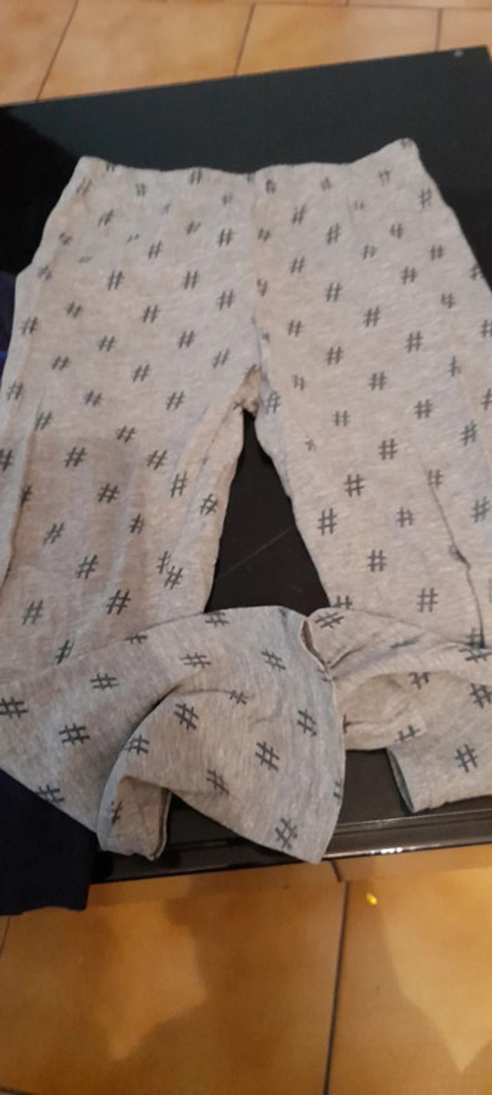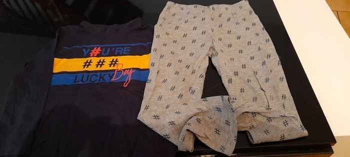 Pyjamas 2 pièces fin,printemps/été Haut bleu marine avec motif coloré, bas gris avec motif noir. Peu porté