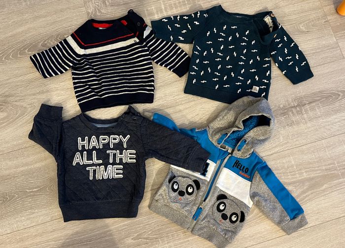 Bonjour ! Je vends ce lot de 4 pulls taille 1 mois en parfait état 1 orchestra 1 kiabi 1 primark (0-3 mois) 1 Obaibi