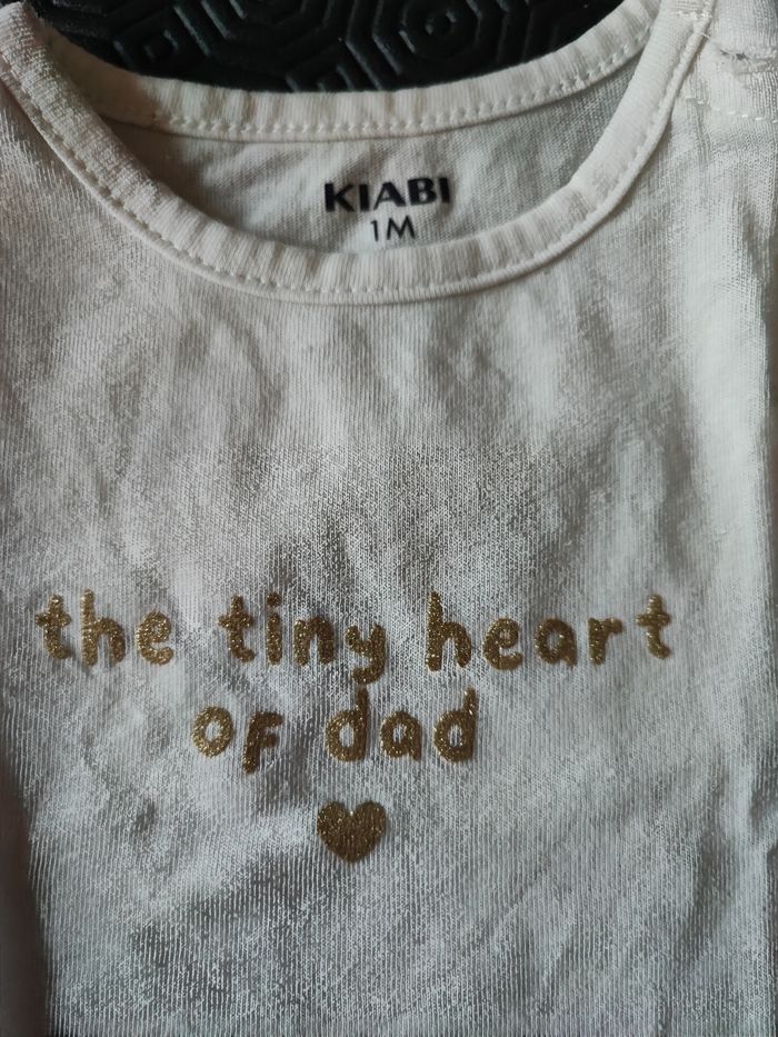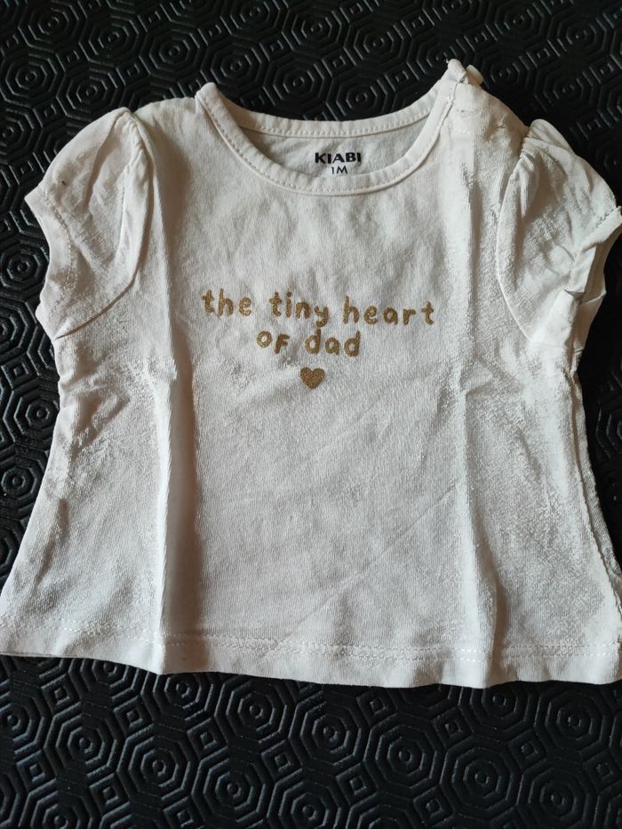 T-shirt à manches courtes de la marque Kiabi en taille 1 mois de couleur blanc avec écriture couleur or à paillettes en très bon état