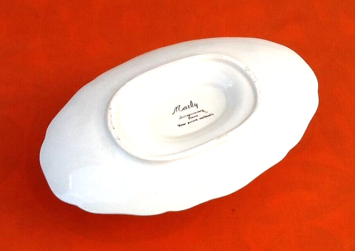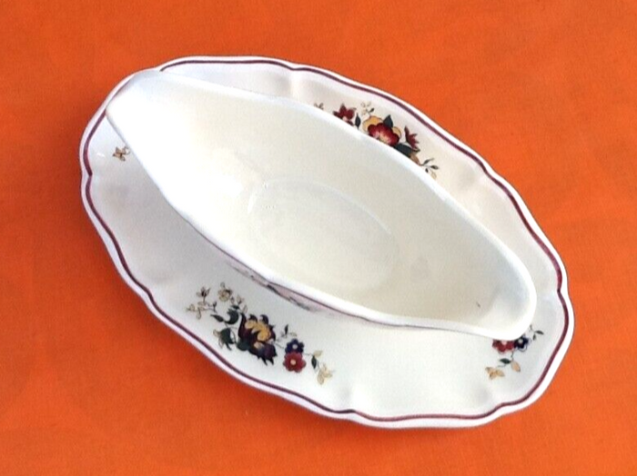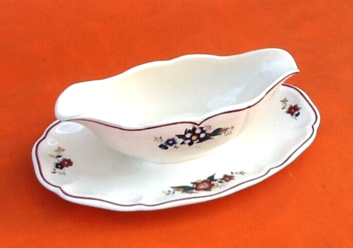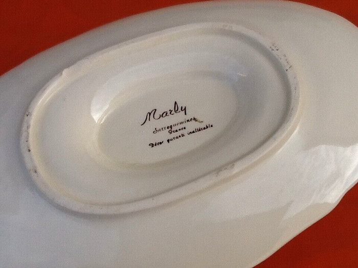 (article vendu en l' état, état d' usage égrenures voir toutes les photos) Saucière sur dormant Faïence de Sarreguemines France Modèle Marly décor bouquets d' anémones Forme polylobée, bords soulignés de filets bordeaux Longueur : 235mm Largeur : 175mm Hauteur : 80mm Poids : 670grs