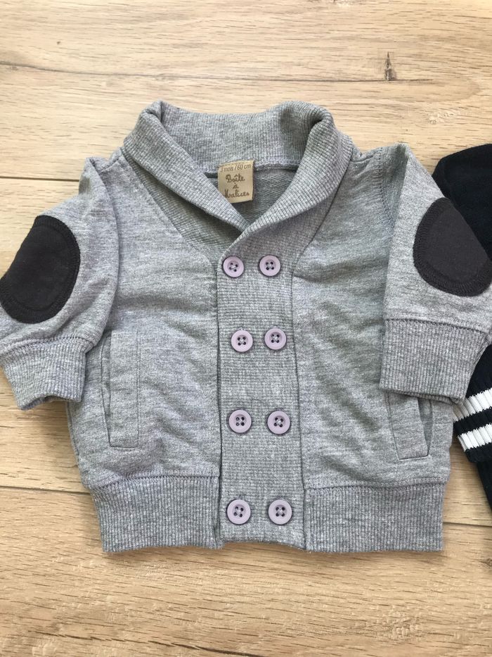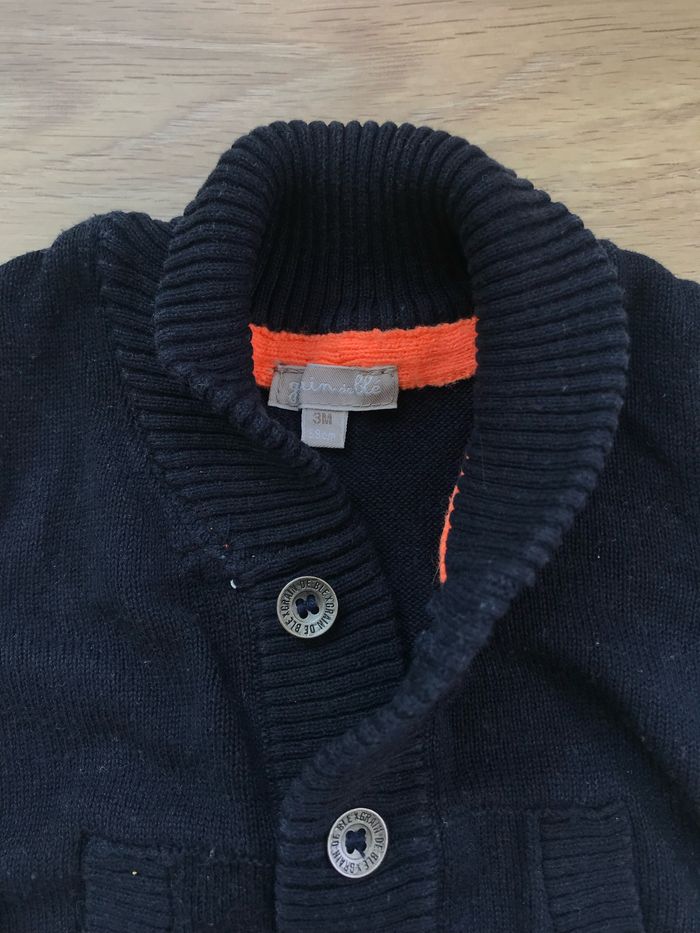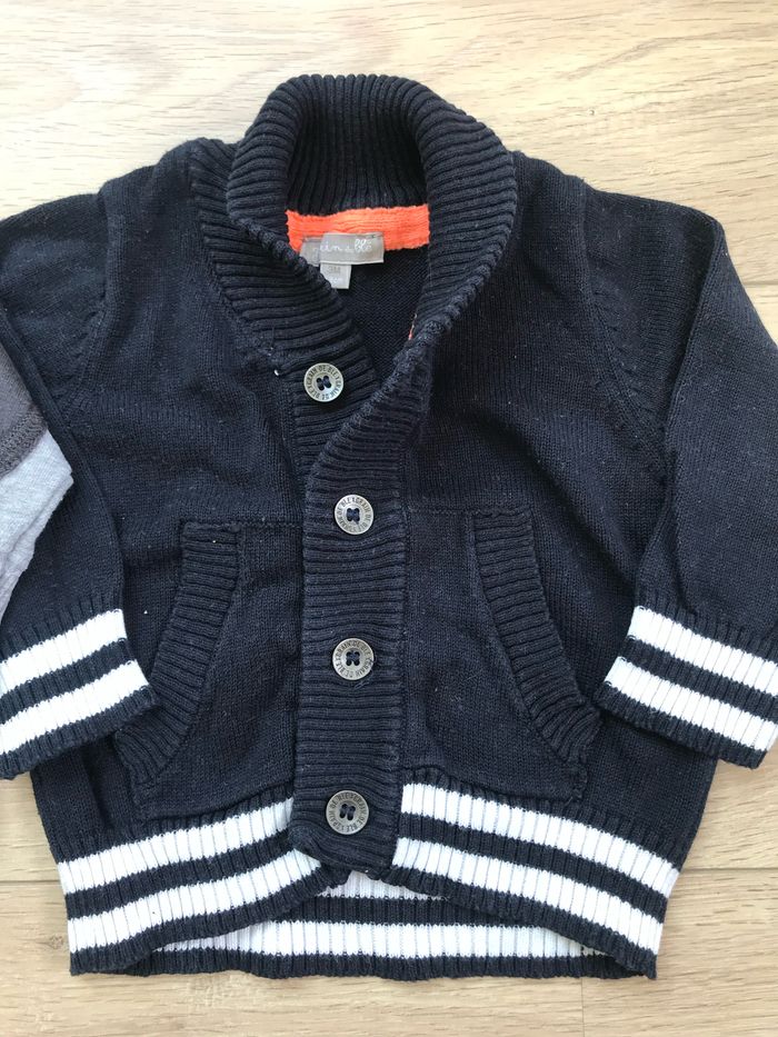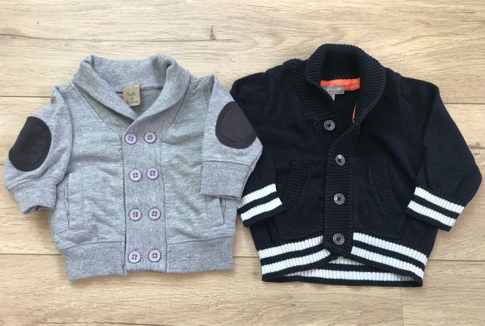 Lot de 2 gilets 3m cols châles un boîte à malices gris chiné à coudières marines, et un grain de blé marine à bandes blanches 7€