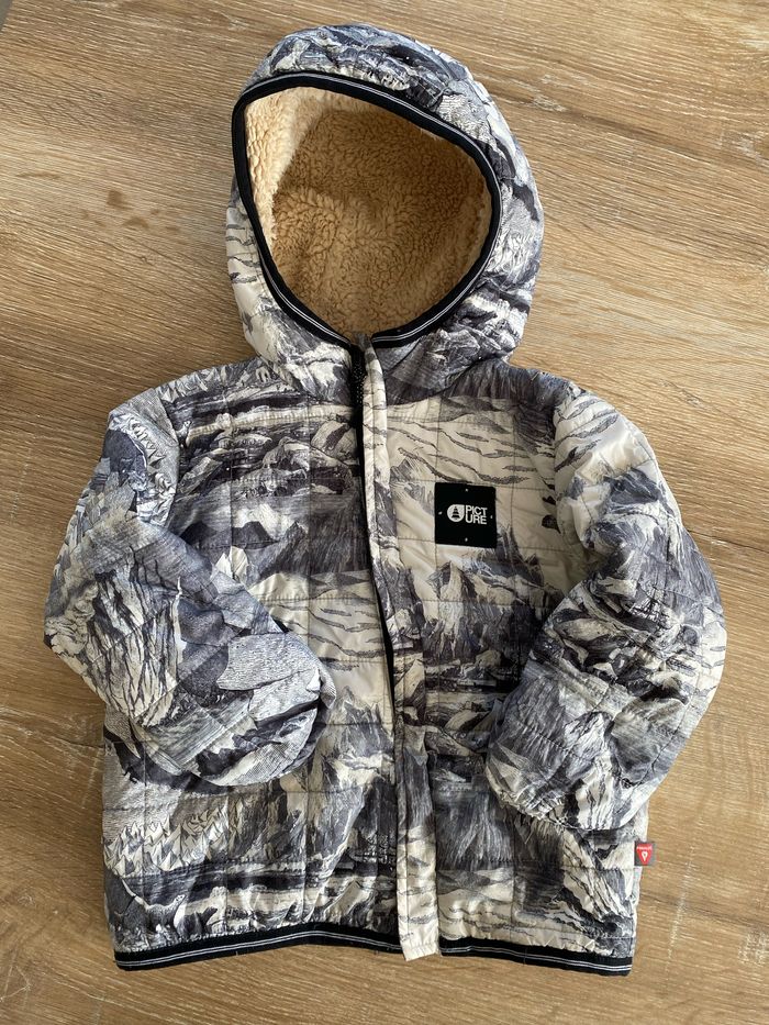 Veste Picture 12-18 mois portes 1 hiver , excellent état . La veste Picture gardera votre bébé au chaud avec son Isolation Primaloft et sa doublure en polaire sherpa pour le côté cocoon et encore plus de chaleur. Composition Doublure en polaire sherpa Manches retroussables Indice de chaleur : 10/10 isolation primaloft 100gr imprimé montagne