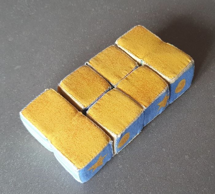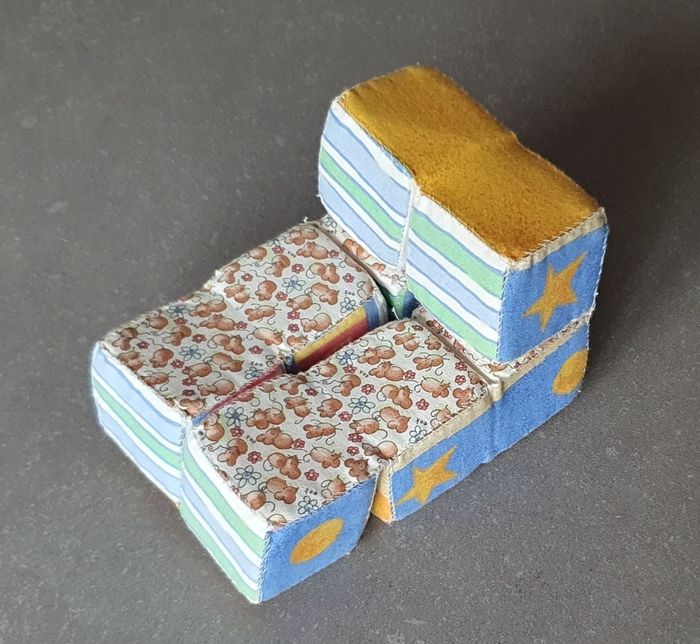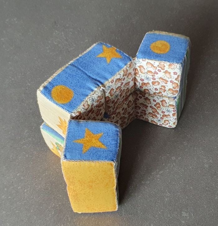 Jouet en tissu sympathique à faire retourner dans tous les sens. Les jonctions entre les cubes permet des mouvements dans une direction, mais le prochain mouvement amène vers une seule autre possibilité. Même pour les adultes, c'est amusant.