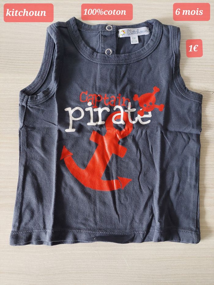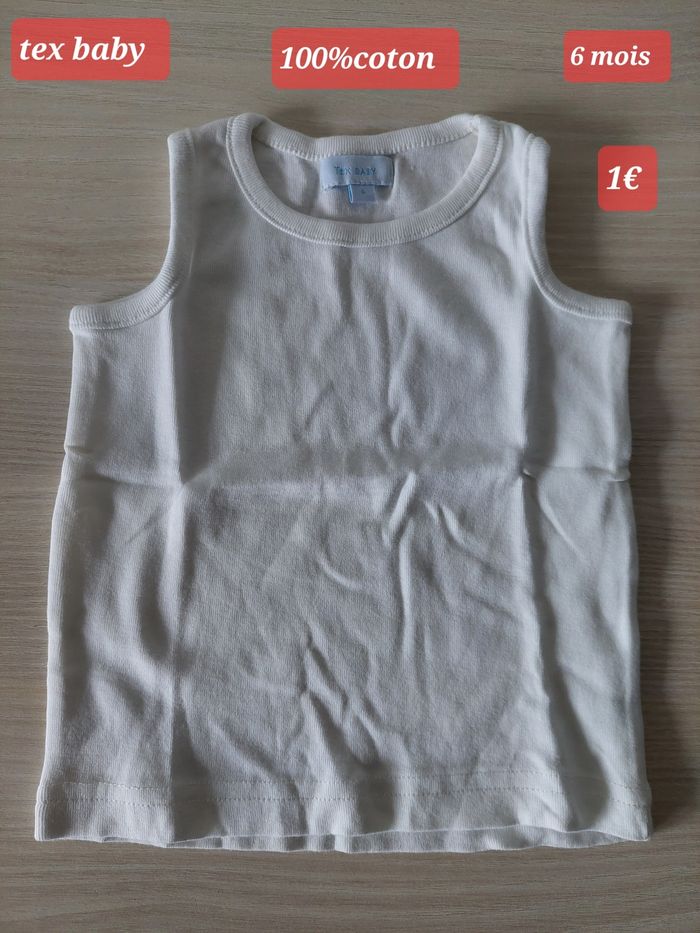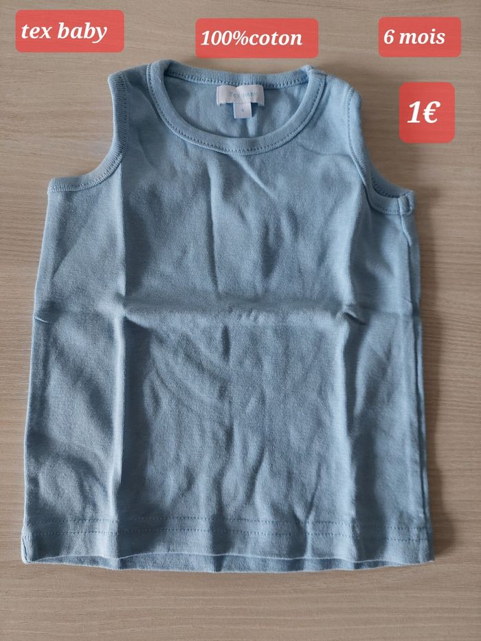 Bonjour Vends 4 débardeurs garçon 6mois . Ils sont en très bon état. Maison non fumeur. La marque et la matière sont écrits sur les photos. 1€ le débardeur