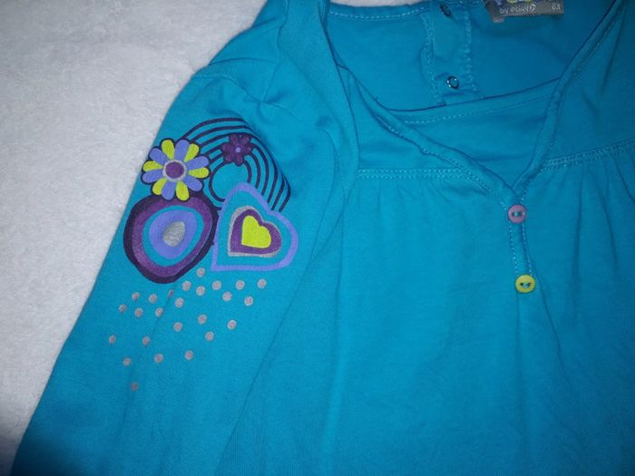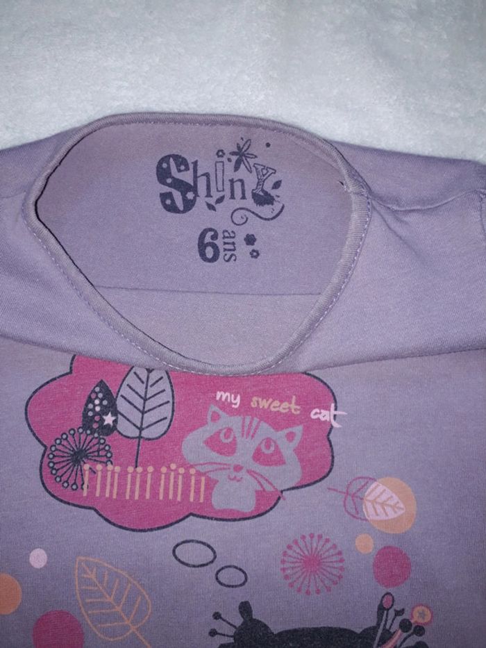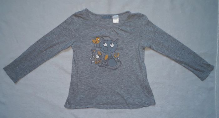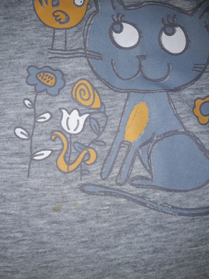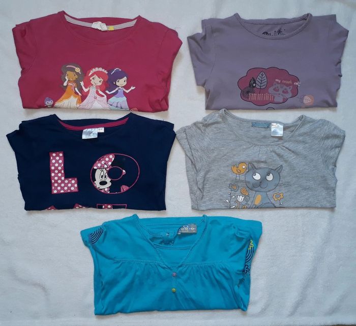 Le bleu ciel a 2 points de couture sous le bras droit (voir photo, ne se voit pas une fois porté), le gris tâche au bout de la queue du chat (voir photo), le violet a été bcp porté , le bleu Minnie 1 point de couture entre le O et le E (voir photo) et le rose noté 8 ans mais taille comme un 6 ans #clo7721_fille6ans