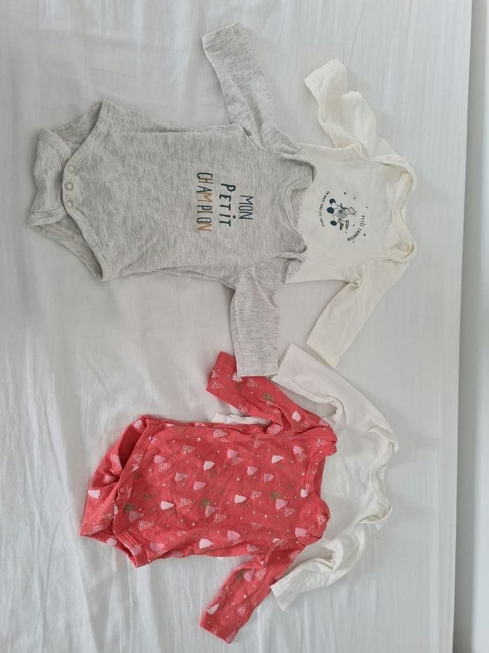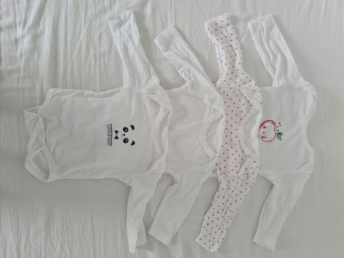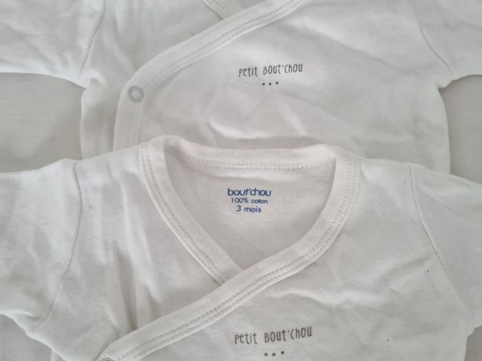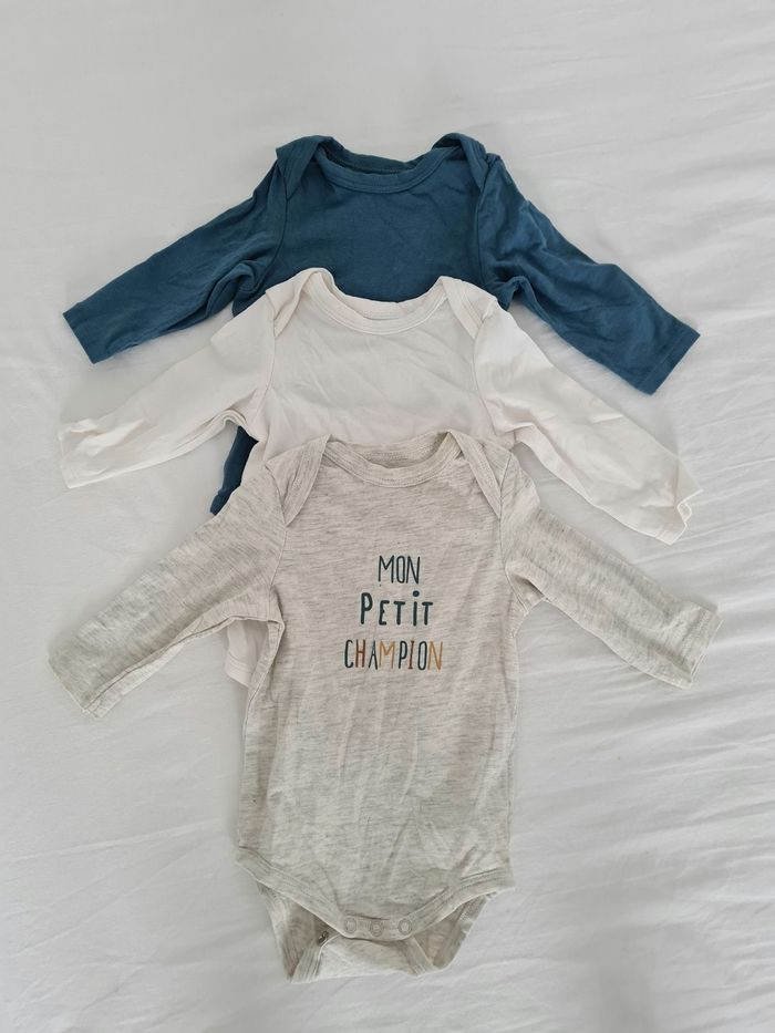Vend le lot à 8 € 6 bodys manche longue 1 mois 12 bodys manches longues 3 mois 8 bodys manches courtes 3 mois 6 bodys sans manches 3 mois Très bon état Mixte Marques Tapes à l'œil Absorba Prix marques