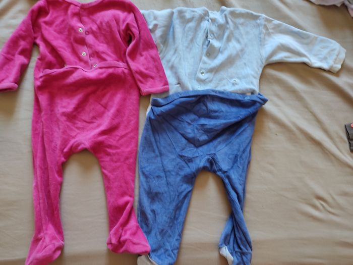 Pour bébé fille de 12 mois -2 pyjamas grenouillère: le bleu a une pression est arrachée voir la photo, le rose est en très bon état 1.50€/ pièce ou 2€ les 2.