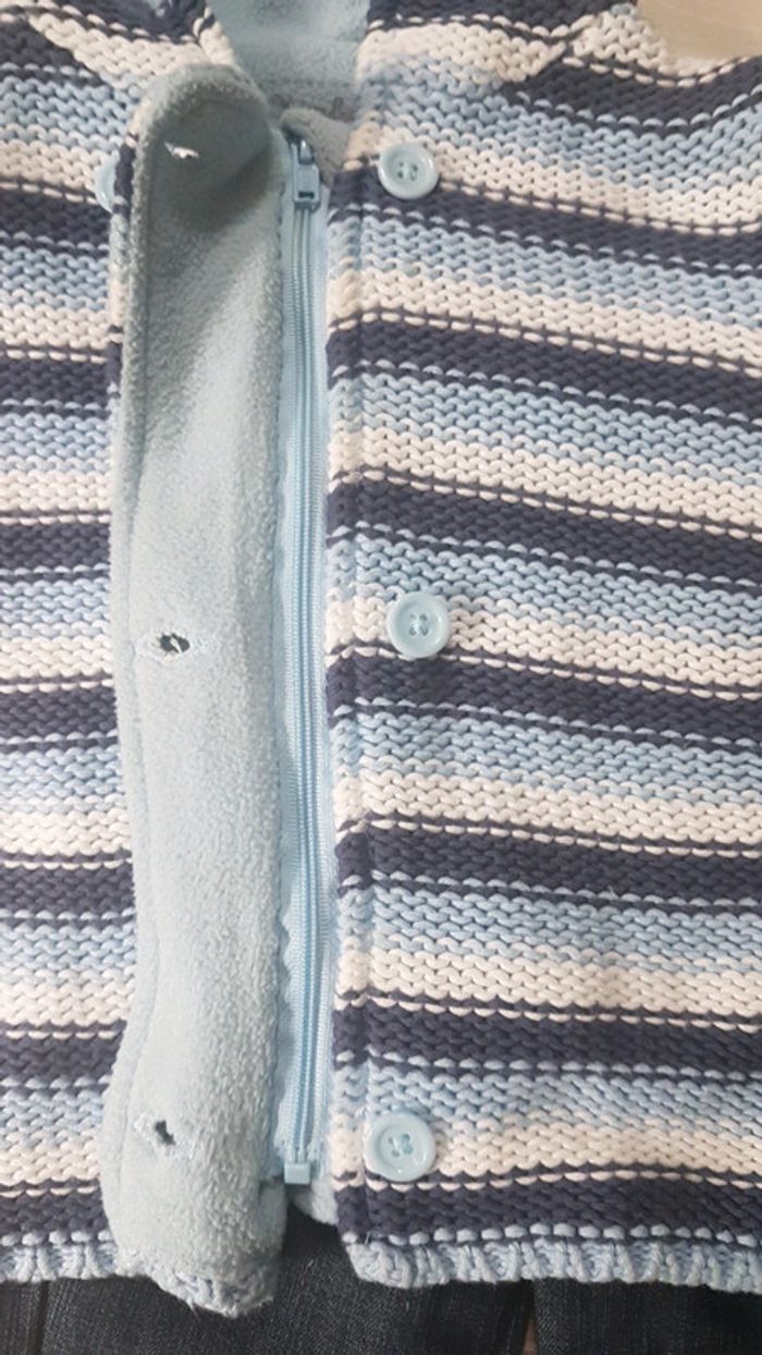 Un gilet bien chaud a capuche doublé polaire avec fermeture et boutons, un pull sans manche col v, un jean souple avec pressions entres jambes et un béret en jean souple.