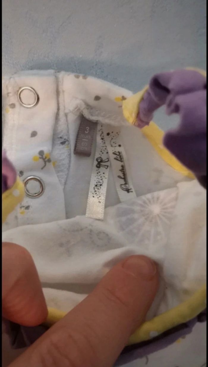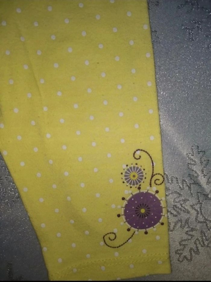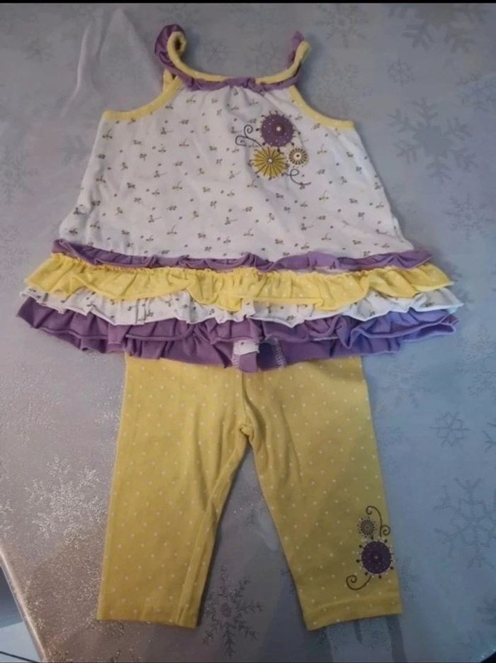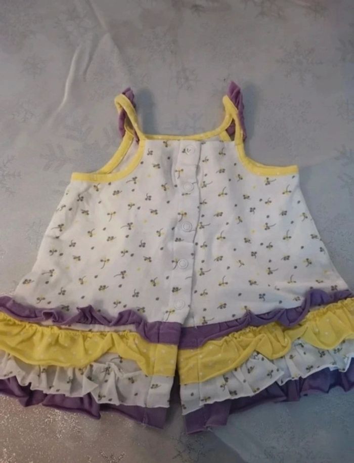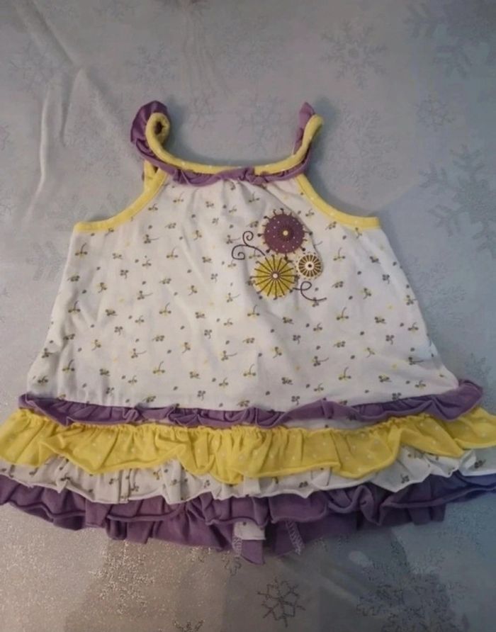 Petite ensemble orchestra : tunique + petit caleçon. Sympa et léger pour les beaux jours. Quelques peluches sur le caleçon (voir la dernière photo), mais rien de choquant une fois porté. Dans les tons blanc / jaune / violet. Il s'agit d'une taille 3 mois / 60 cms #volants #noeud #fluo #pois #fleurs #été #soleil #legging #bébéfille #3mois #mvasseur74430bébéF #blanc