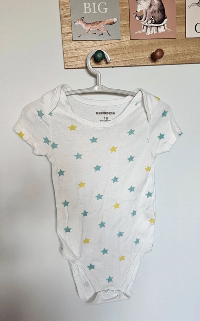 Lot de 10 bodys manche courte. 9 viennent d'orchestra, taille 18 mois (81cm) 1 vient de kiabi, taille 18 mois ( 77-82cm) Petits défauts à voir sur les photos, et certains font des petites bouloches à force de les laver. Beaucoup porter cet été.