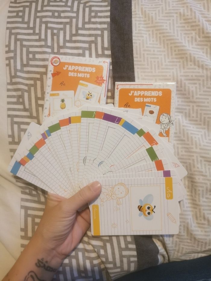 Jeu de cartes complet, elles sont recto/verso et permettent à l'enfant de voir les majuscules et les minuscules.